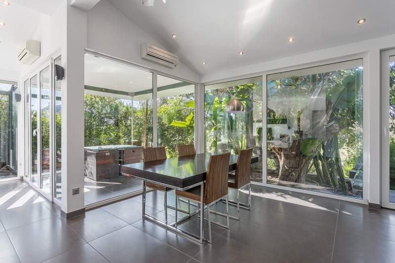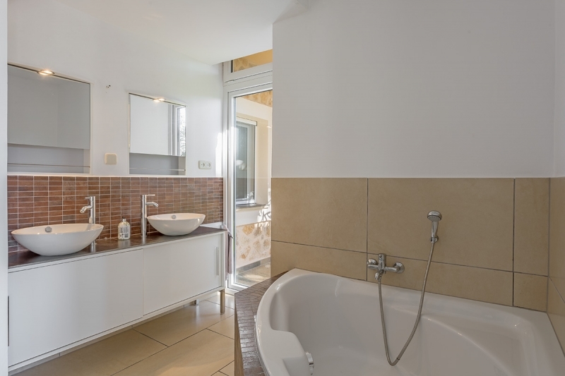 Der untere Bereich des Haupthauses teilt sich auf in einen grossen und modernen Wohnbereich, komplett mit Fensterfronten, einer offenen Hochglanz Küche sowie 4 Doppel Schlafzimmer mit Bädern en Suite + ein weiteres Schlafzimmer und ein Ankleidezimmer. Das Masterschlafzimmer ist mit eine freistehenden Badewanne sowie einer grossen, modernen Dusche ausgestattet.