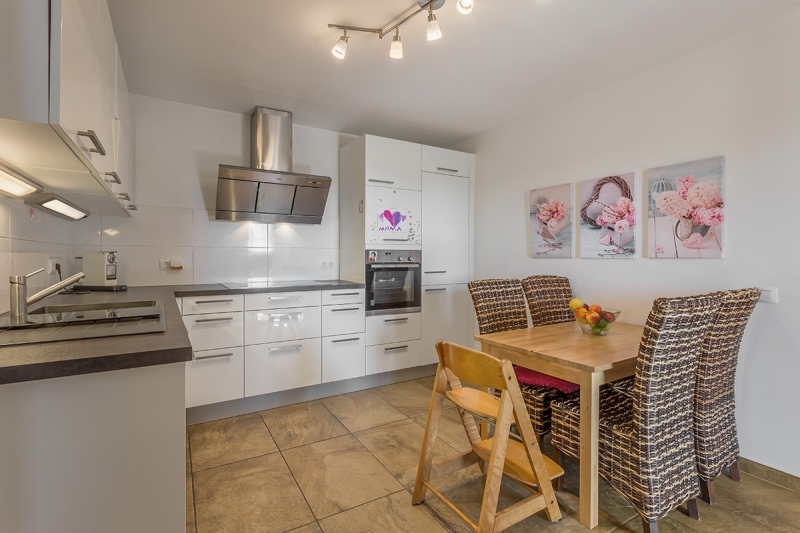 Der obere Bereich des Hauses besteht aus einem grossen Wohnbereich mit offener Küche sowie einem kleinen Schlafzimmer sowie einer weiteren, grossen Terrasse.