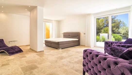 Über eine Treppe gelangt man ins Erdgeschoss. Dort befinden sich 4 grosszügige Schlafzimmer mit jeweils Bade en suite, sep. Gäste-WC und Zugang zu weiteren sonnigen Terrassenflächen und dem schön angelegten Garten und Privatpool. Im Master-Schlafzimmer gibt es einen großen, begehbaren Kleiderschrank inkl. Panikschalter, der die gesamte Villa beleuchtet.