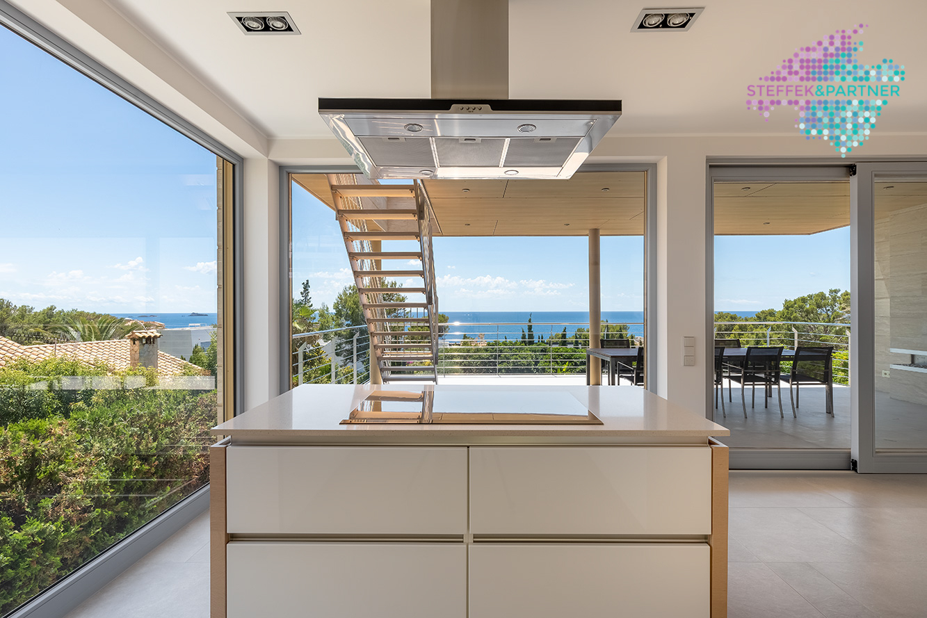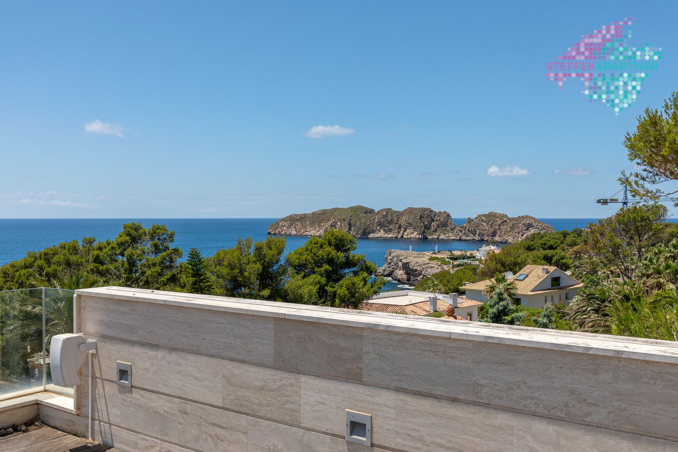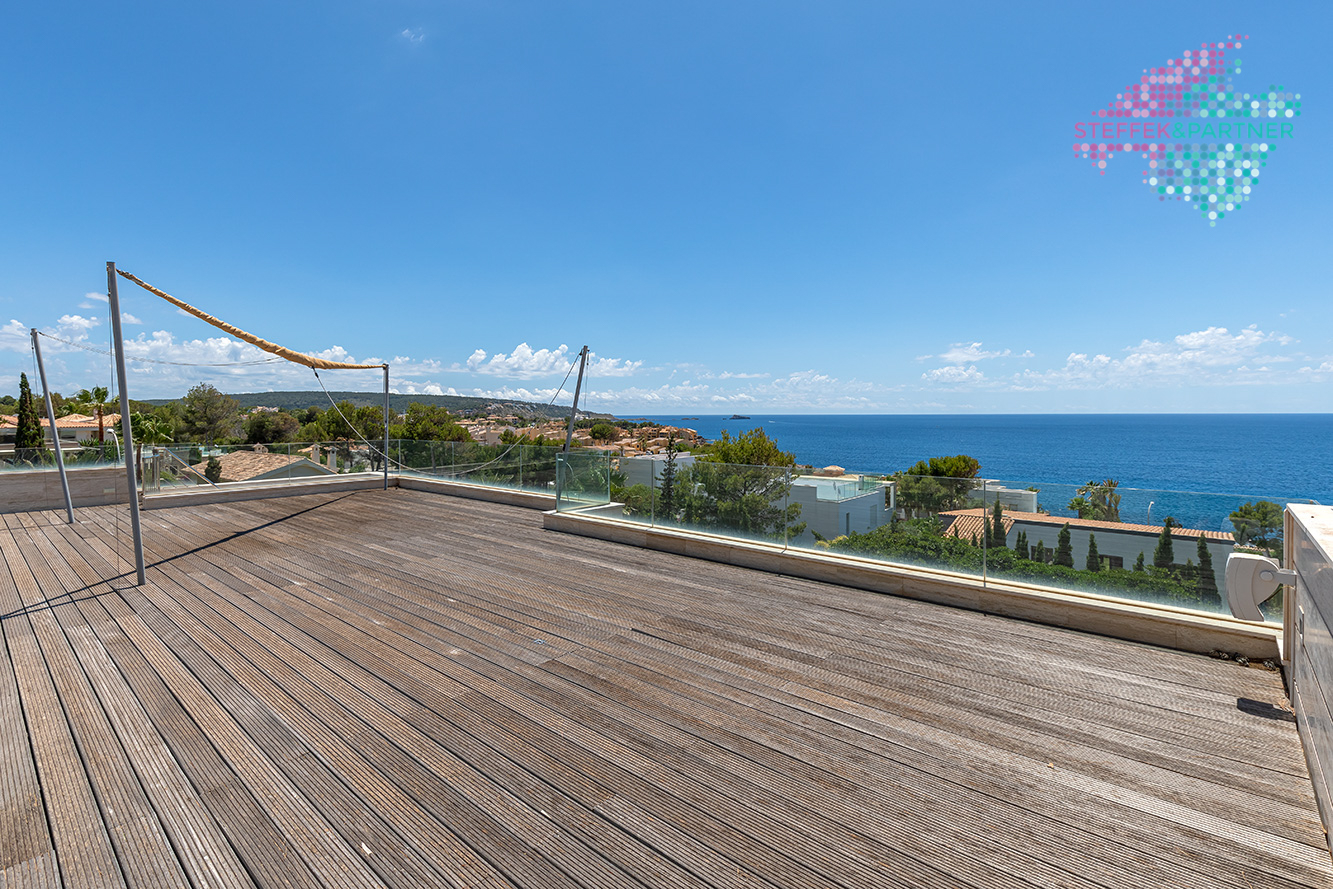 Die Meerblick Villa wurde 2011 auf einem ca. 1.108 m² großen Grundstück mit Garten gebaut und verfügt über eine Wohnfläche von 335 m².Die großzügige Wohnfläche verteilt sich über 2 Ebenen und besteht aus 4 Schlafzimmern und 4 Badezimmern. Außerdem verfügt die Villa in Nova Santa Ponsa über eine große Eingangshalle, ein Wohn-Esszimmer mit Kamin sowie eine hochwertige Küche. Diese Immobilie auf Mallorca überzeugt durch den fantastischen Meerblick, Eleganz und Qualität.