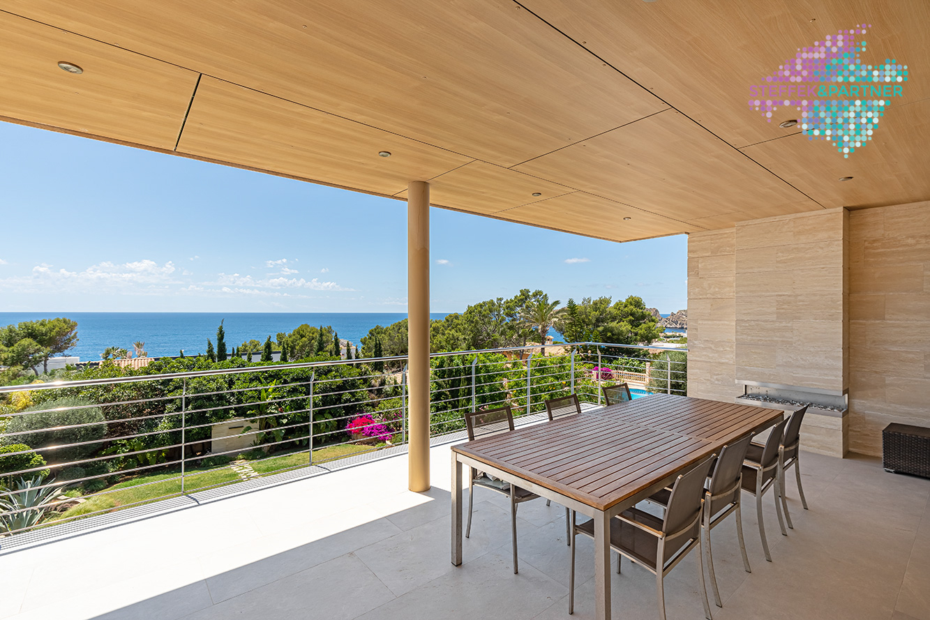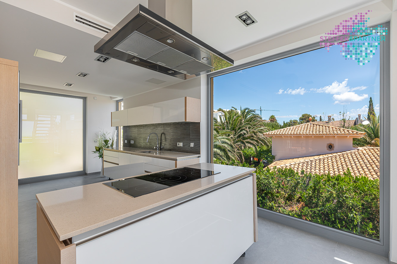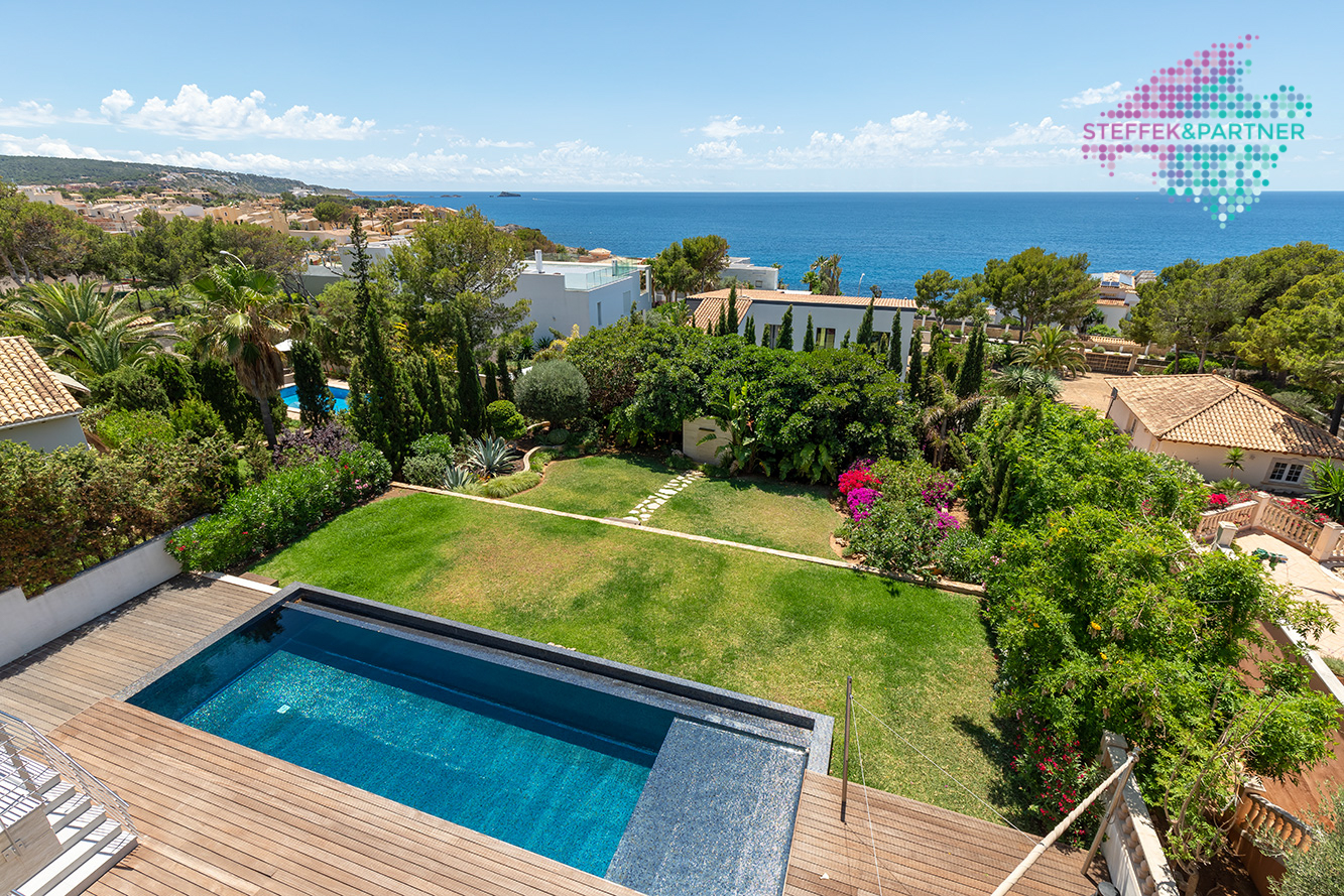 Die Meerblick Villa wurde 2011 auf einem ca. 1.108 m² großen Grundstück mit Garten gebaut und verfügt über eine Wohnfläche von 335 m².Die großzügige Wohnfläche verteilt sich über 2 Ebenen und besteht aus 4 Schlafzimmern und 4 Badezimmern. Außerdem verfügt die Villa in Nova Santa Ponsa über eine große Eingangshalle, ein Wohn-Esszimmer mit Kamin sowie eine hochwertige Küche. Diese Immobilie auf Mallorca überzeugt durch den fantastischen Meerblick, Eleganz und Qualität.