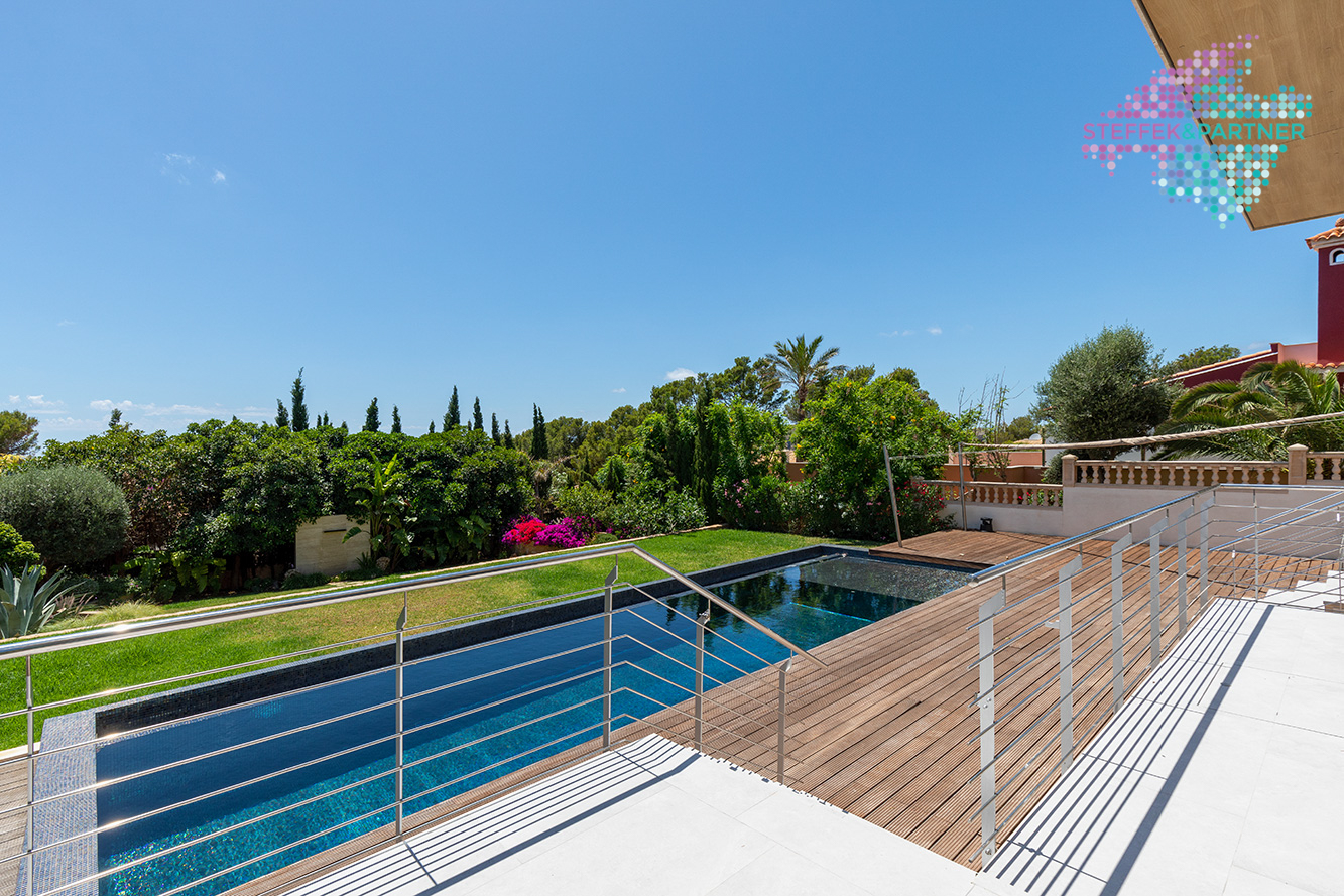 Ein großer Pool mit modernster Technik und Sonnenterrasse lädt zum Badespaß und Relaxen ein. Die Rasenflächen bieten auch einer Familie mit Kindern viel Platz zum spielen.