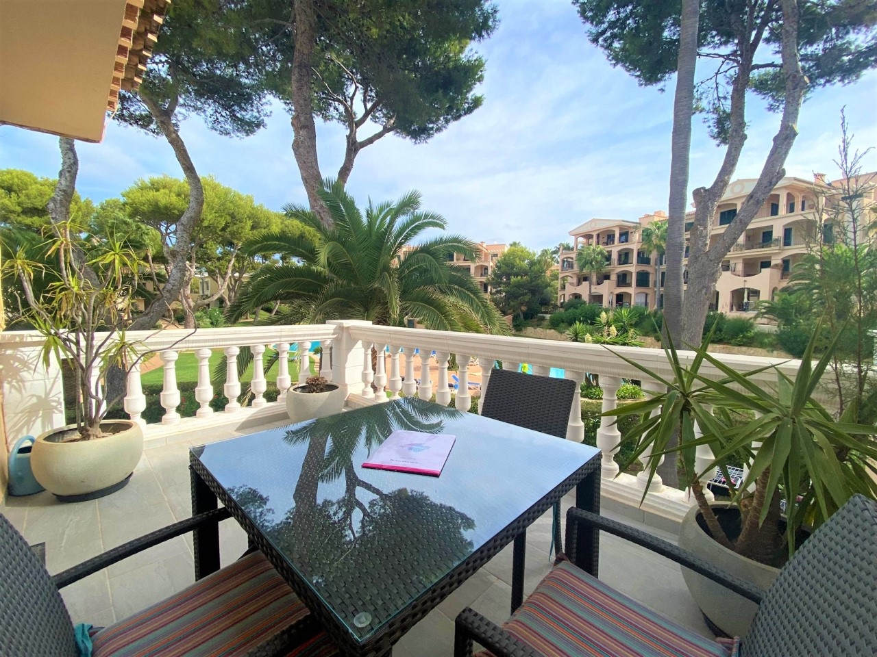 Der schöne Gemeinschaftspool Bereich ist in einem Park ähnlichem Garten angelegt.