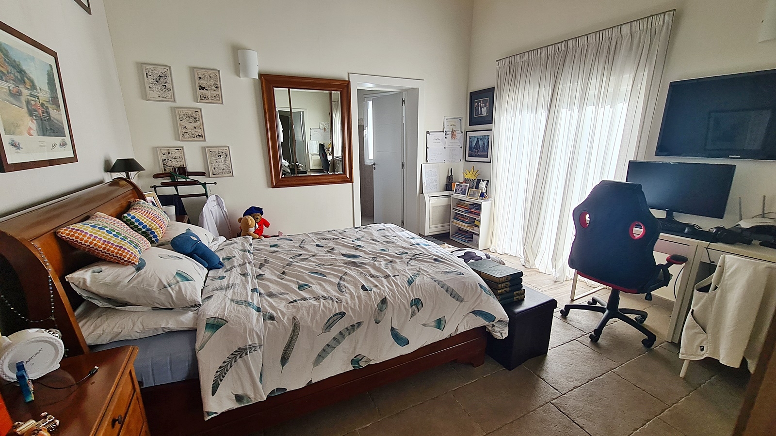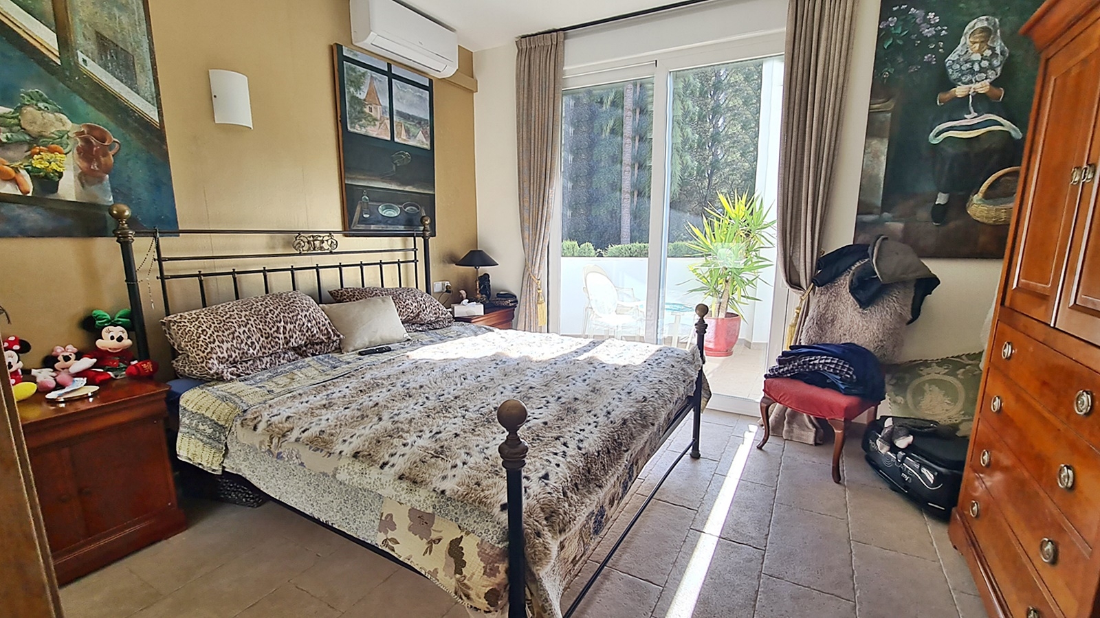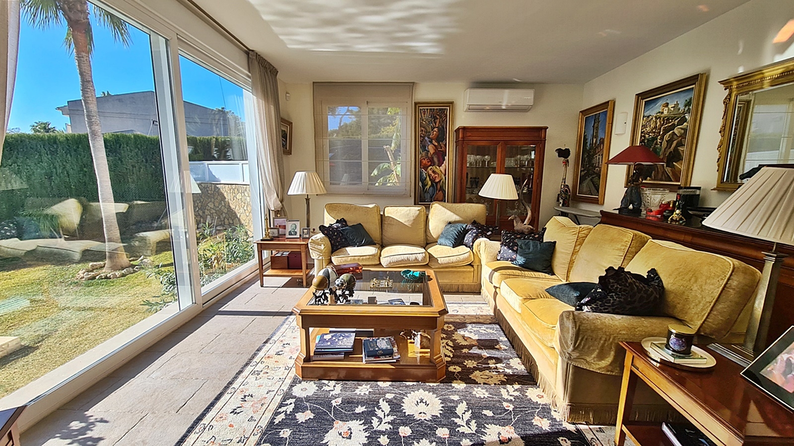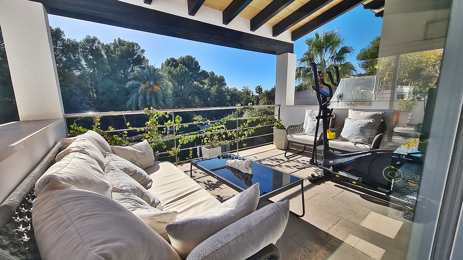 Die obere Etage verfügt über ein weiteres Wohnzimmer mit 3,90m hohen Decken mit Holzbalken und Zugang zu einer überdachten und einer offenen Terrasse mit elektrischer Markise, zwei Doppel-Schlafzimmer jeweils mit Bad en suite und eigenem Balkon.