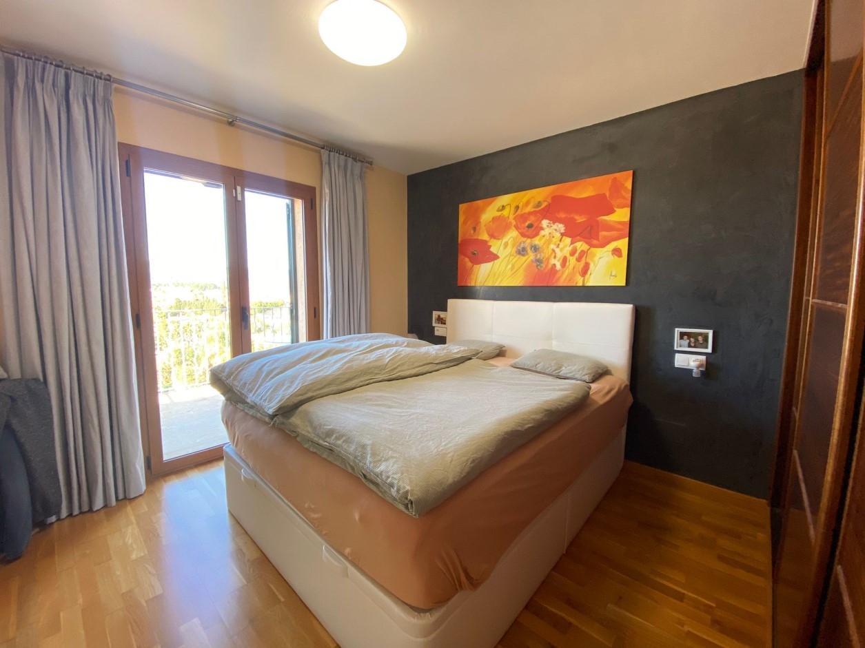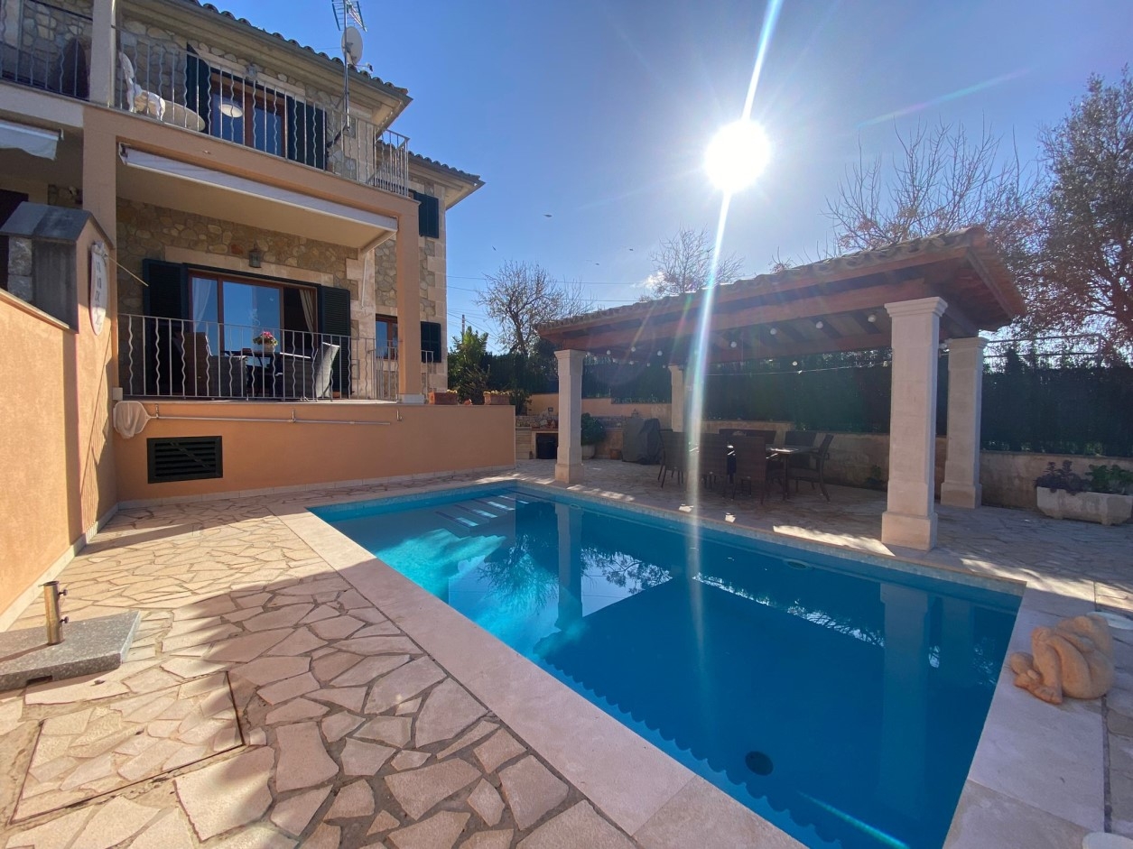 Doppelhaus Baujahr 2009 mit wundervollem weiten Bergblick bis zum Meer.Das Haus ist im traditionellen Finca Stil erbaut und liegt sehr privat und ruhig. Der Garten ist mediterran und doch pflegeleicht bepflanzt und hat diverse Sonnen und Schattenplätze rund um den 23 m2 grossen Pool.