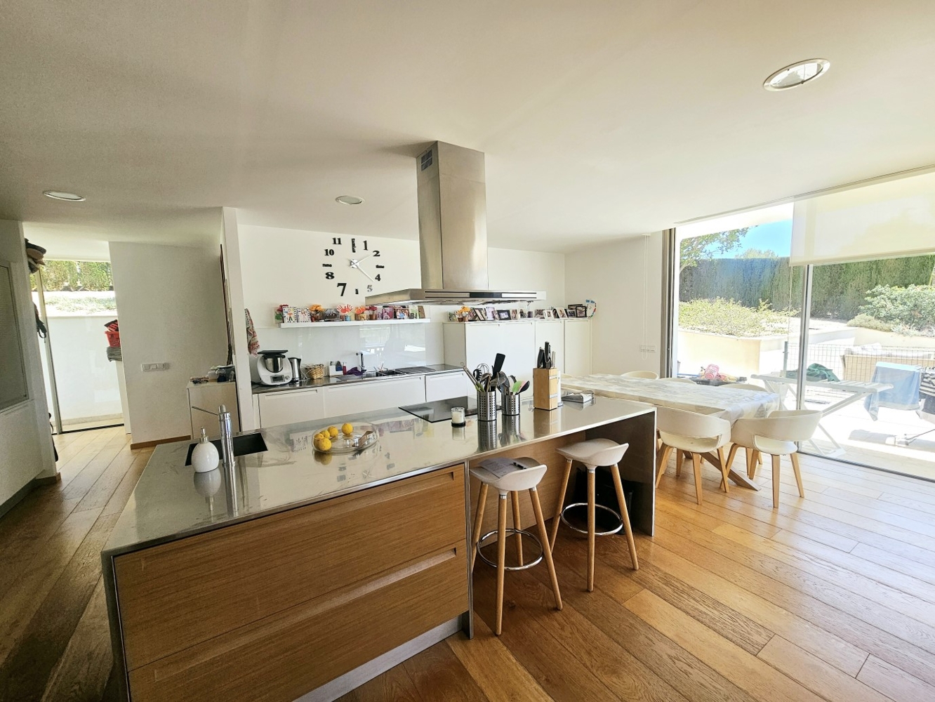 Moderne, Licht durchflutete Villa und der Traum aller Auto Liebhaber. Hier gibt es eine Garage für 5 PKW in welcher Sie Ihre "Schätzchen" sicher aufbewahren können. Die Villa bietet aber noch viel mehr. Moderne Technik, Standnähe und sehr viel Platz.Das Erdgeschoss besteht aus einem großen Wohn-Essbereich, offener und voll ausgestatteter Küche, Speisekammer, Waschküche, Gäste WC, und einem Schlafzimmer mit Ankleidezimmer und Badezimmer en suite. Es verfügt über zwei große Terrassenn und einem Infinity Pool mit einer Tiefe von 2 Metern sowie ein weiteres Badezimmer mit Zugang von außen durch den Pool und die Veranda.