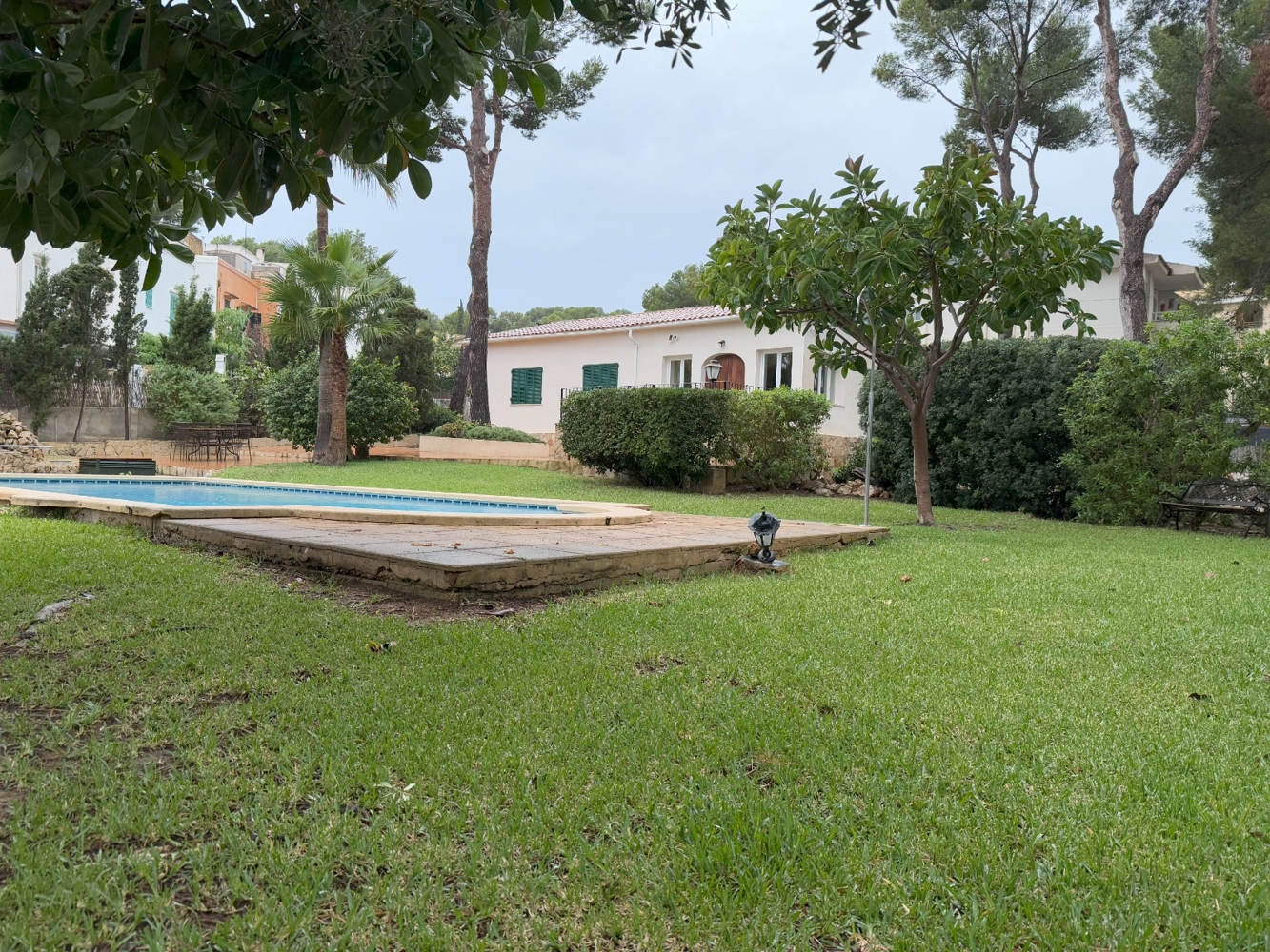 Aktuell teilt sich die Villa wie folgt auf: Grosser Eingangsbereich der direkt in das Wohnzimmer des Hauses führt, neben dem die große Küche mit Essbereich und direktem Zugang zur Außenseite des Hauses ist. Das Haus verfügt über 1 WC, 1 komplettes Badezimmer und 4 Schlafzimmer mit herrlichem Blick auf die große Außenterrasse (eines davon en suite). Im Aussenbereich gibt es einen grossen Garten und diverse Terrassen sowie einen Swimmingpool. Das Grundstück ist sehr flach und weist kaum Unebenheiten oder Steigungen auf. Es hat einen Fußgängereingang und einen Eingang für Autos mit Garage neben dem Haupthaus.