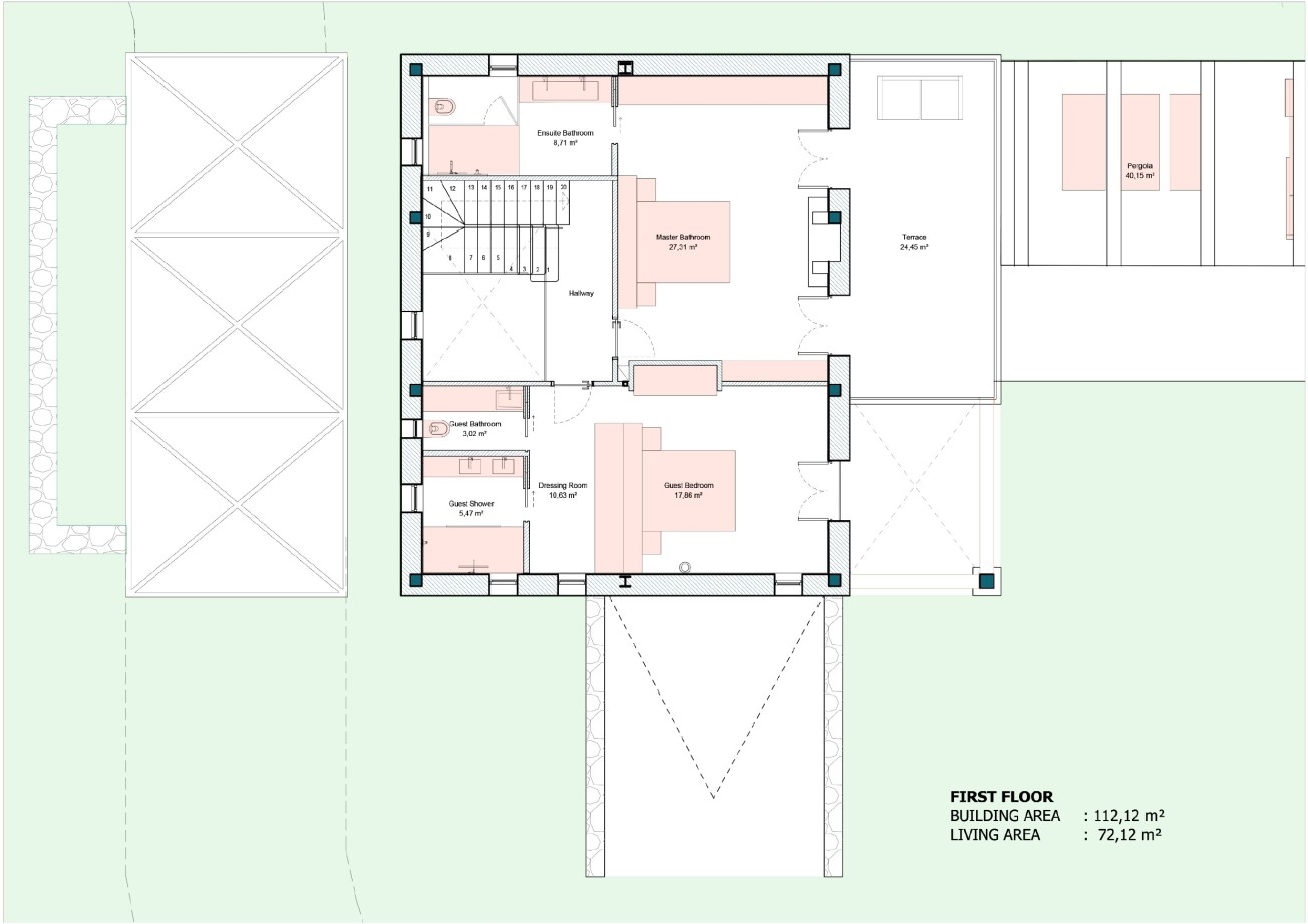 In der 1. Etage finden Sie ein grosses Master Schlafzimmer mit Ankleidezimmer und Bad en Suite sowie ein weiteres Schlafzimmer und ein Bad. Das Master Schlafzimmer hat eine 25 m2 grosse Terrasse mit fantastischer Aussicht.