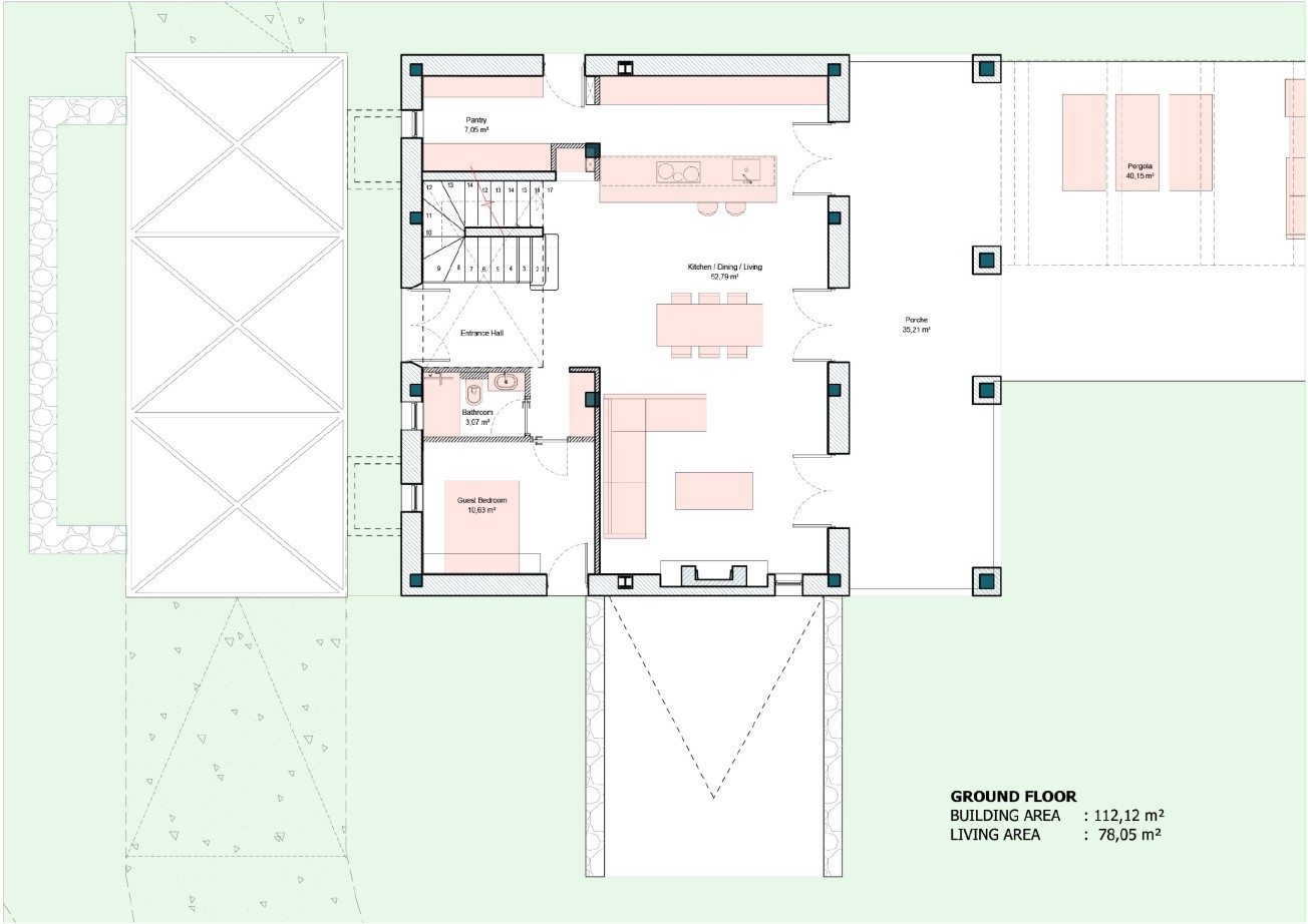 Im Erdgeschoss befindet sich der Eingangsbereich, ein 53 m2 grosser Wohnbereich mit offener Designer Küche, 1 Gäste Schlafzimmer sowie ein Bad. Vom Wohnbereich aus erreicht man die 35 m2 grosse, überdachte Terrasse von welcher aus man zum Pool gelangt.