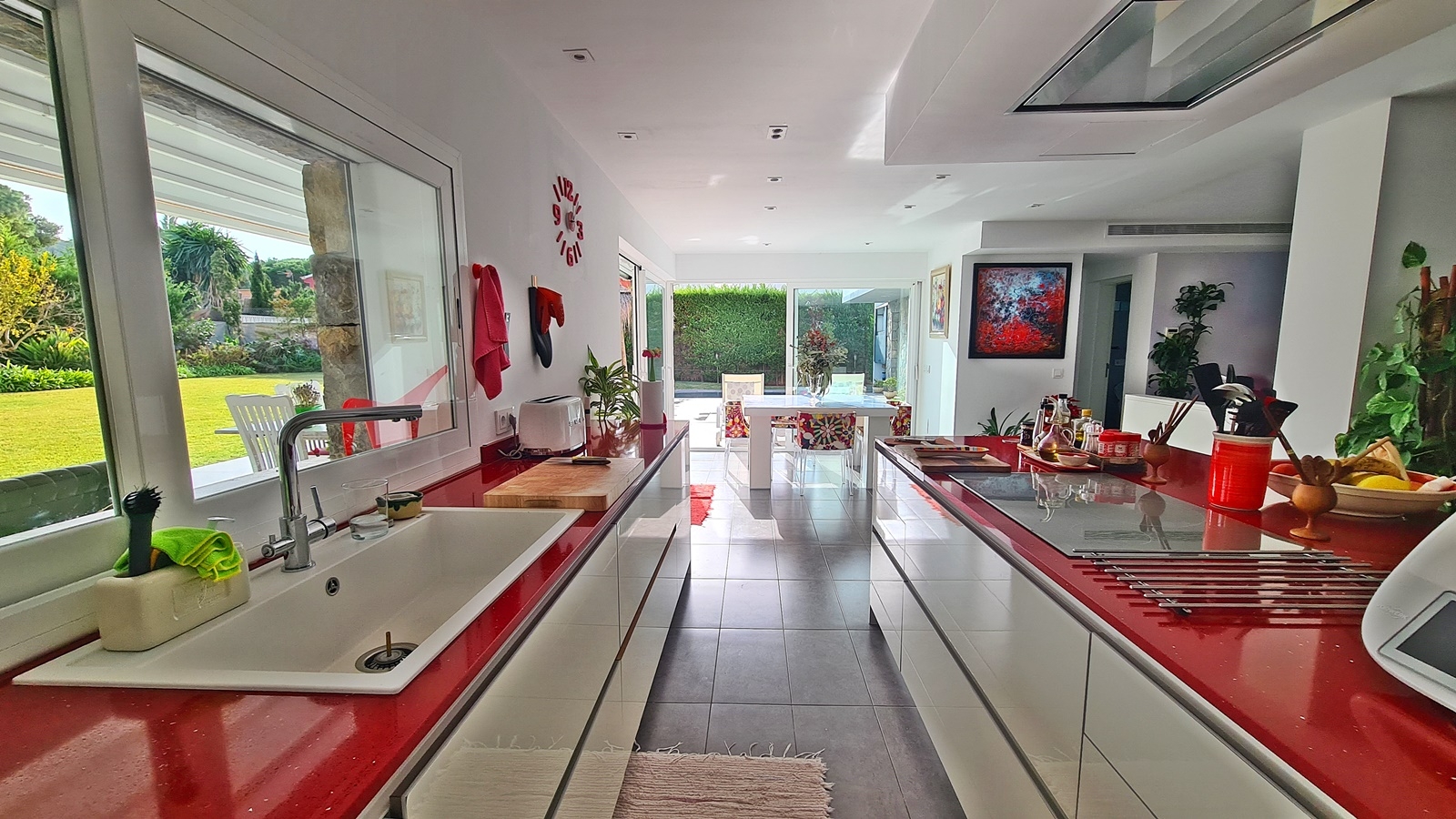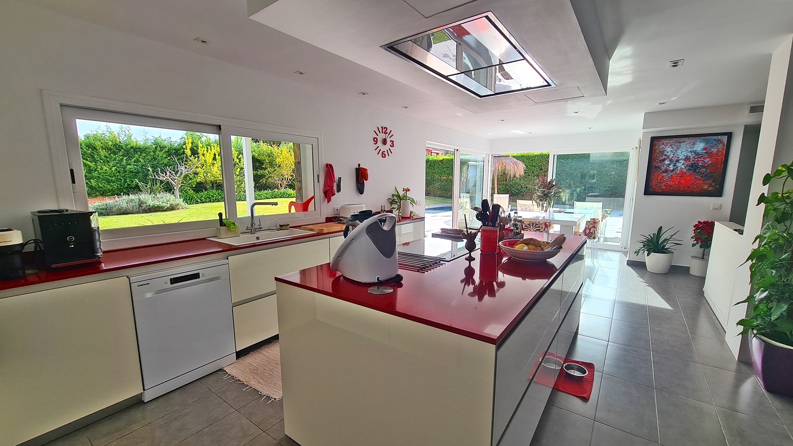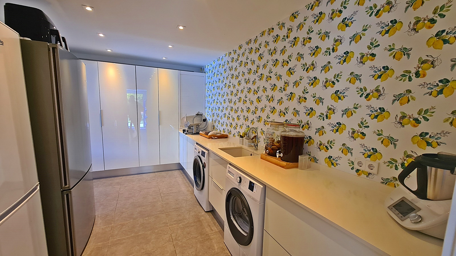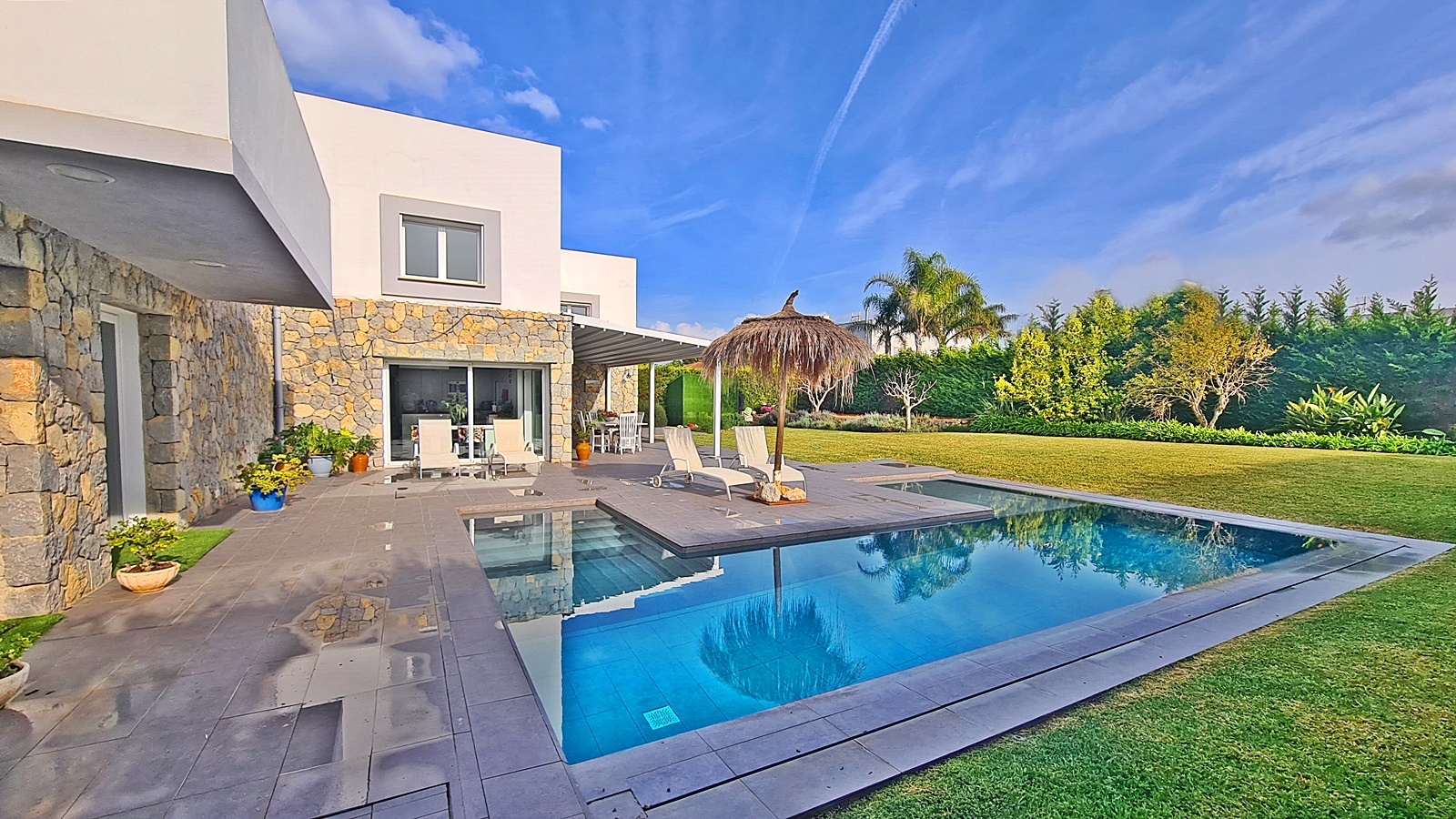 Im Erdgeschoss befindet sich das große Wohn-Esszimmer mit Ausgang zu Poolbereich und Garten, offener moderner Eibau- Küche, ein Schlafzimmer mit Bad en suite, Gäste WC sowie großem Technikraum und Waschküche. Der Poolbereich punktet ausserdem mit separatem Bad und einem weiteren Raum, welcher als Gästezimmer oder Poolbar genutzt werden kann.