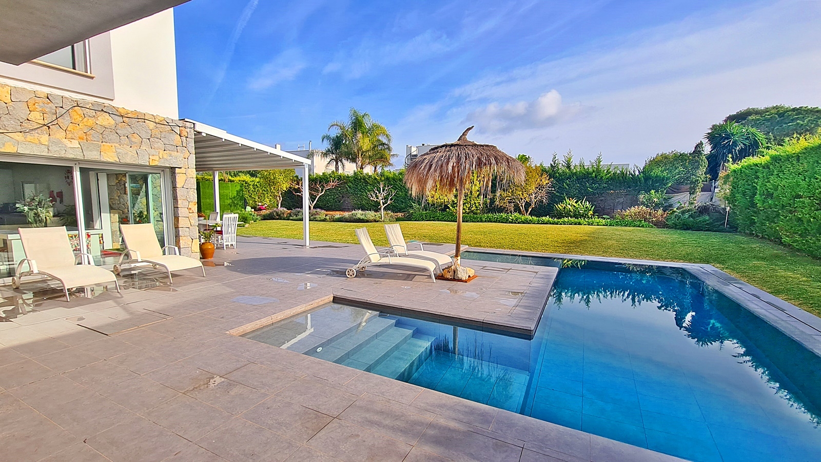 Luxusvilla mit elegantem Pool und sehr gepflegtem, grossen Garten in ruhiger Wohngegend nahe Port Adriano, im Südwesten Mallorcas kaufen.Diese Villa auf einem 1000 m2 großen Grundstück wurde ca. 2020 fertiggestellt und verfügt über eine bebaute Fläche von 450 m2, davon ca. 255 m2 Wohnfläche, verteilt auf 2 Ebenen.