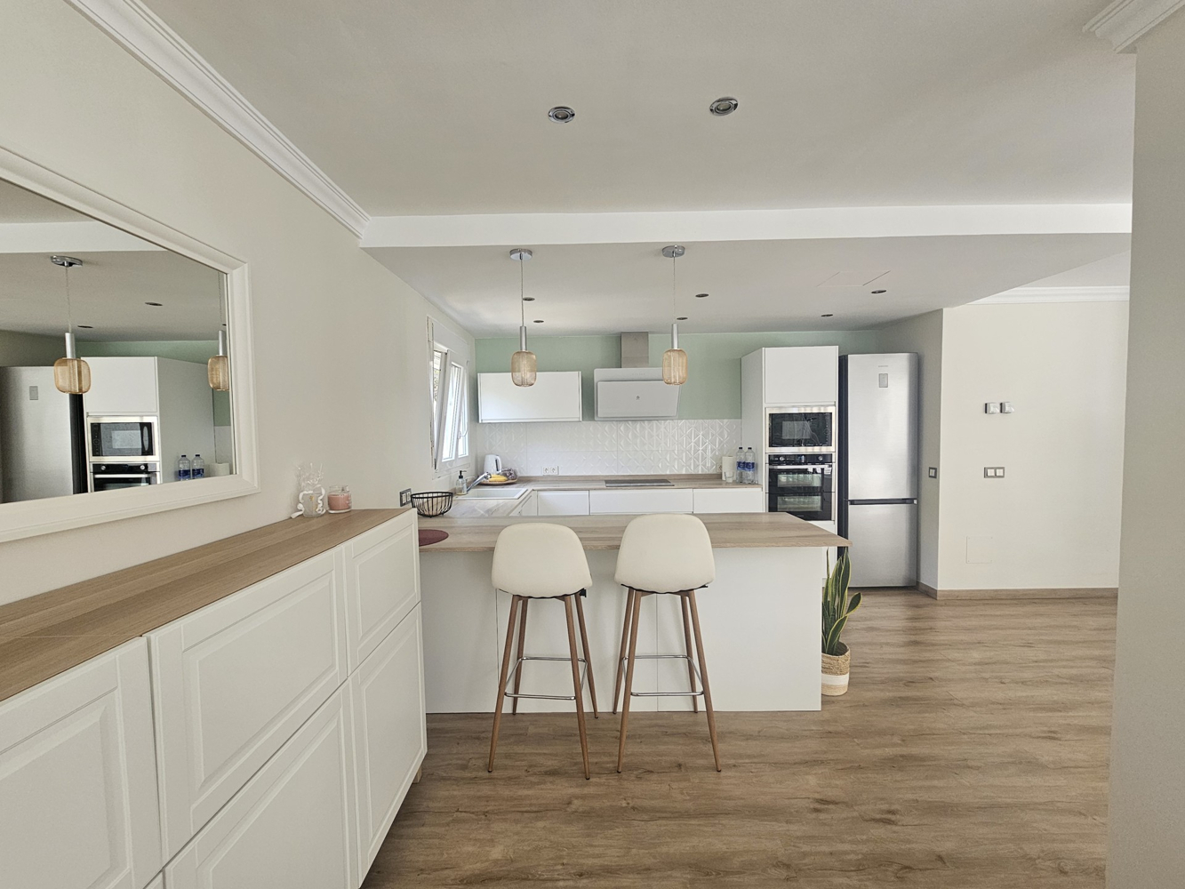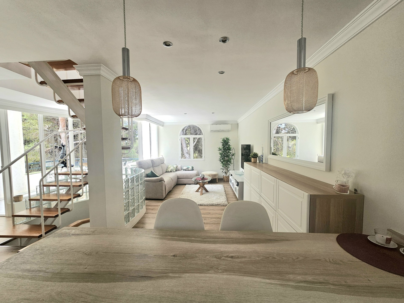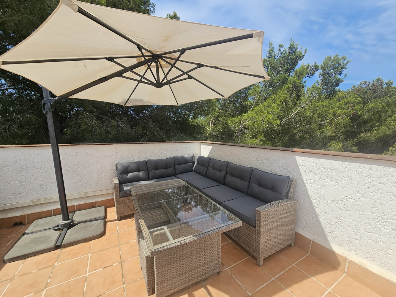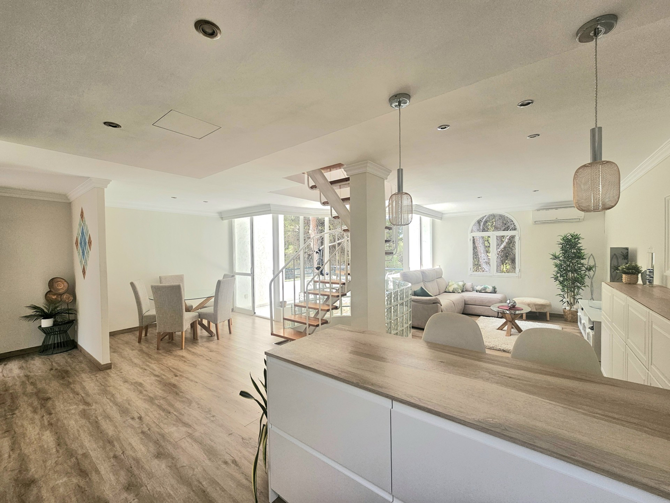 Dieses wunderschön renovierte Eckhaus in einer der begehrtesten Wohnanlagen von Sol de Mallorca bietet Ruhe, Privatsphäre und modernen Komfort. Eingebettet in einen ruhigen Wald, werden Sie von Vogelgezwitscher geweckt und genießen den Zugang zu einem gepflegten Gemeinschaftspool.Das Haus verfügt über drei geräumige Schlafzimmer und zwei stilvolle Badezimmer, alle im Erdgeschoss gelegen, für mehr Privatsphäre und erholsamen Rückzugsort. Der zweite Stock bietet einen hellen und luftigen, offenen Wohnbereich mit einem modernen Wohnzimmer, einem Essbereich und einer komplett renovierten Küche mit hochwertigen Geräten – perfekt für den Alltag und die Unterhaltung.