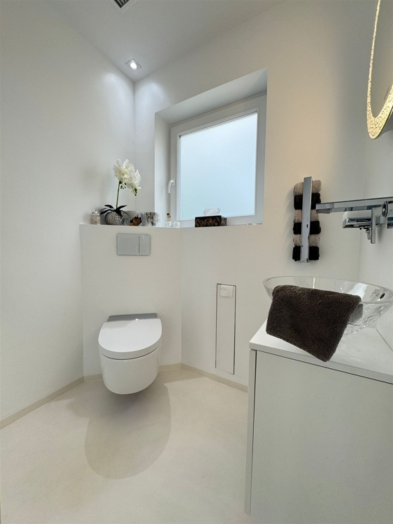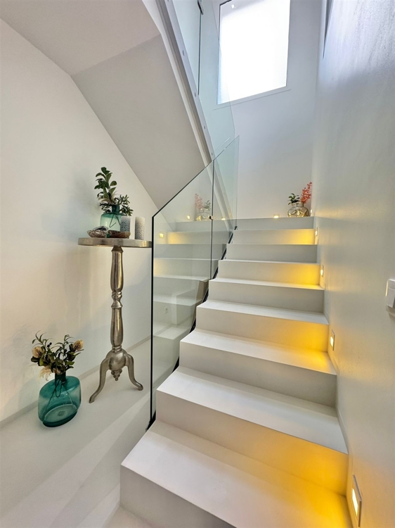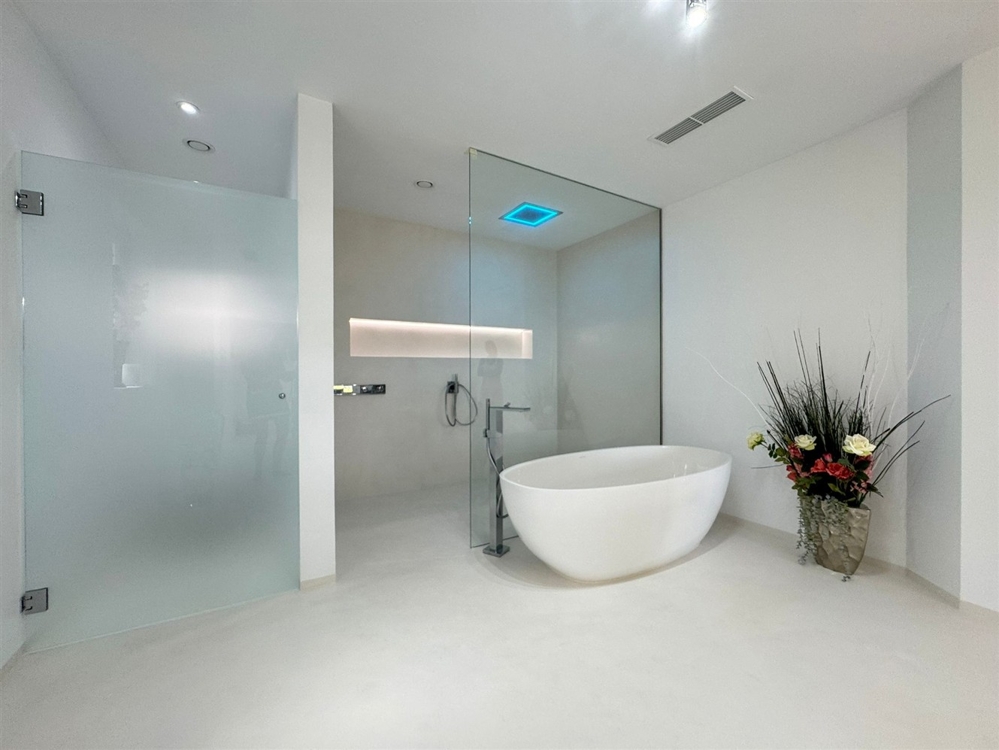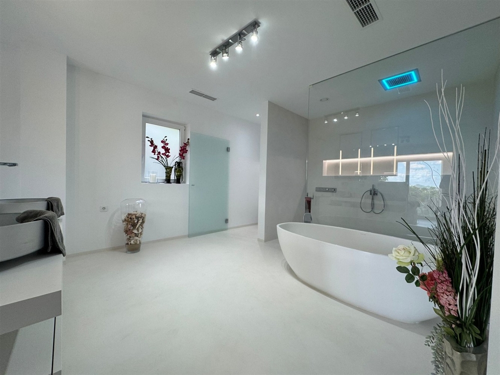 Das gesamte Anwesen wurde mit hochwertigem, weißem Microzement gestaltet, was dem Haus ein elegantes, harmonisches Erscheinungsbild verleiht.
