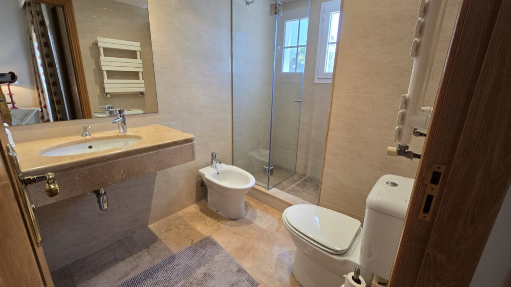 Zur Ausstattung gehören zudem ein Gäste-WC, Klimaanlage, Heizkörper, praktische Einbauschränke, ein Hauswirtschaftsraum, ein separates Abstellzimmer sowie zwei Stellplätze innerhalb der Anlage.