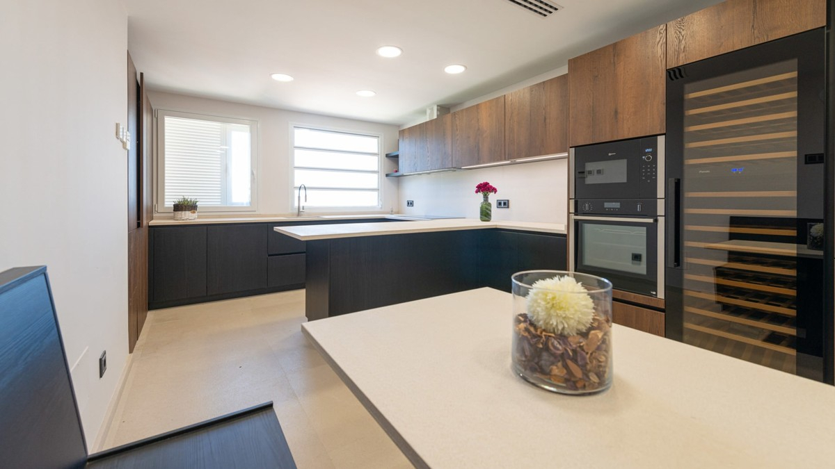 Das Herzstück des Penthouses ist das großzügige Wohnzimmer, das mit großen Fenstern und direktem Zugang zur Terrasse einen atemberaubenden Blick auf das Mittelmeer eröffnet. Hier können Sie den Tag mit Sonnenaufgang beginnen und abends den Sonnenuntergang genießen. Die angrenzende, separate Designerküche bietet nicht nur eine hochwertige Ausstattung, sondern auch Platz für kulinarische Kreationen auf höchstem Niveau.
