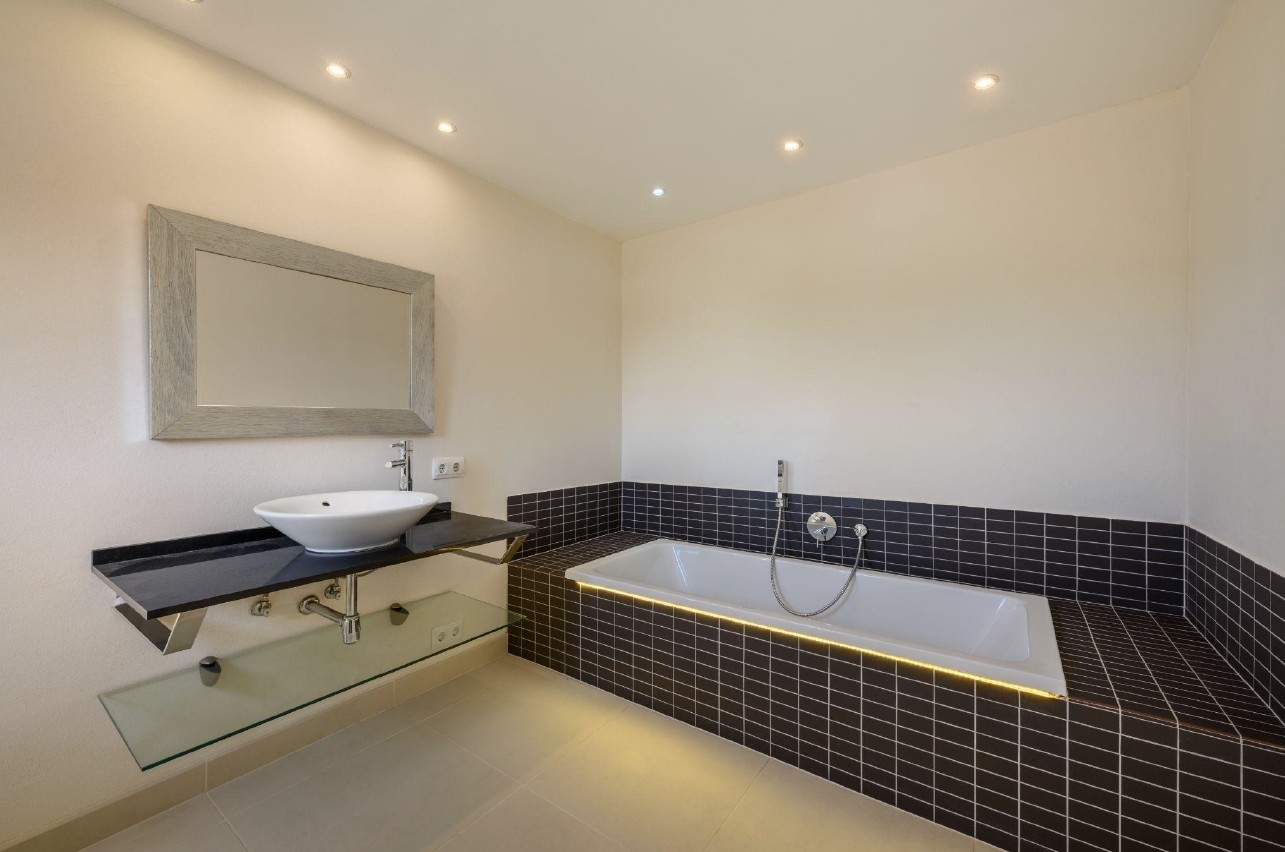 Im Erdgeschoss befindet sich der repräsentative Wohn- und Essbereich mit offener Küche, der ein einladendes und kommunikatives Wohnambiente schafft. Ebenfalls auf dieser Wohnebene liegt die großzügige Master-Suite mit Ankleidezimmer, die aus der ehemaligen Garage hochwertig umgebaut wurde. Ergänzt wird diese Ebene durch ein Büro, einen Wirtschaftsraum sowie ein Gäste-WC, wodurch komfortables Wohnen auf einer Ebene möglich ist.