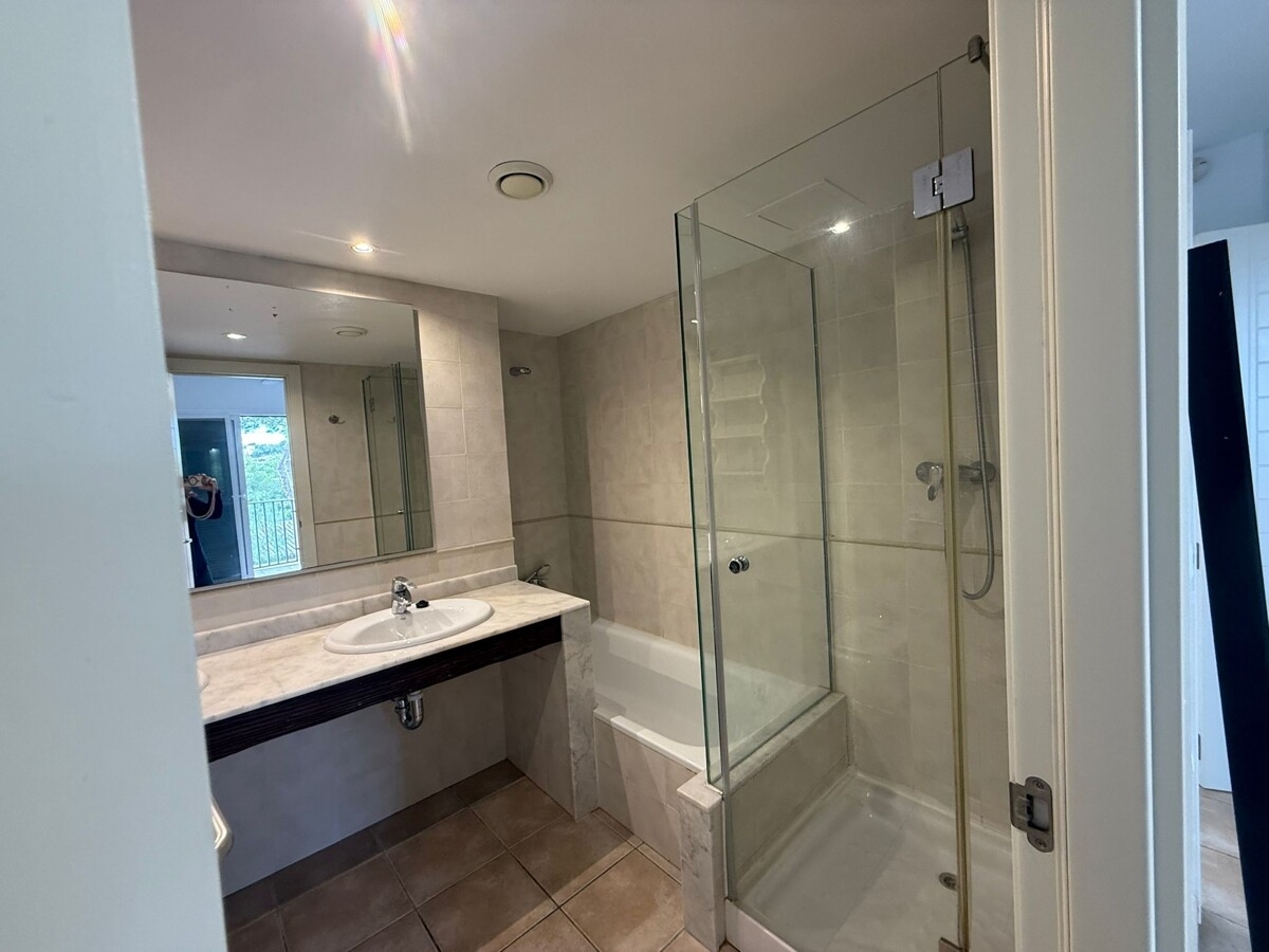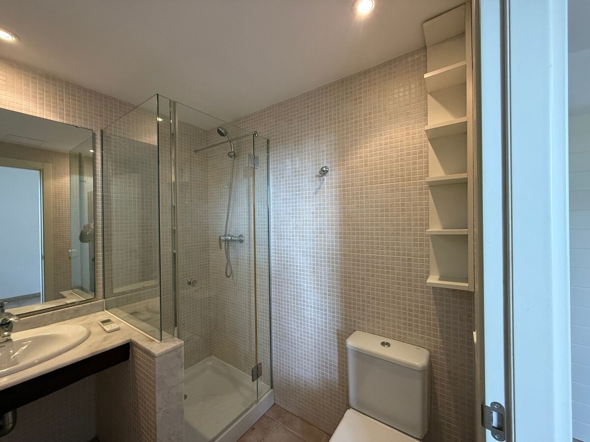 Der Wohnbereich ist hell und einladend gestaltet und verfügt über einen separaten Essplatz. Die offene, moderne Küche ist funktional ausgestattet und fügt sich harmonisch in den Wohnraum ein. Ergänzt wird das Raumangebot durch ein separates Gäste-WC, einen Hauswirtschaftsraum sowie einen Abstellraum. Eine zentrale Klimaanlage und deckenhohe Einbauschränke sorgen für zusätzlichen Wohnkomfort.