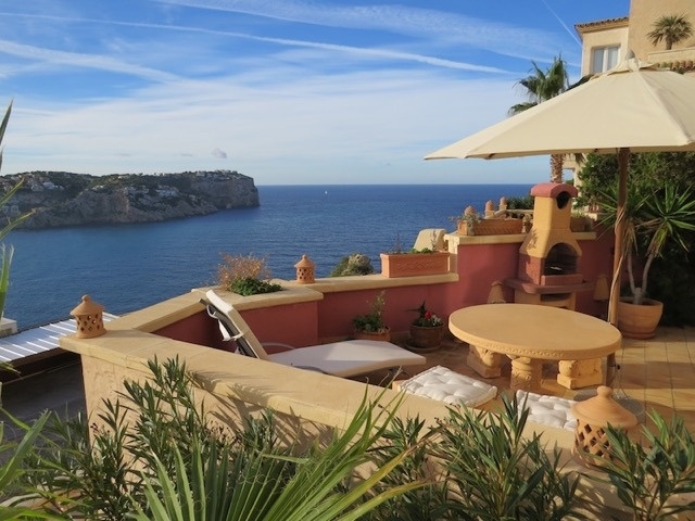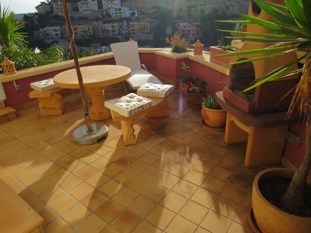 This Mediterranean apartment offers about 90 m2 of living space plus terraces and is located in a prime location in Cala Moragues with an unobstructed and unique views of the sea, the opposite peninsula La Mola and the harbor of Port Andratx. The village center with all its popular restaurants, cafes and shopping venues is just 5 minutes away. It offers a large living room with fireplace and open kitchen, two bedrooms and two bathrooms. Two large terraces, partly covered, one with barbecue area invite you to relax. The small condominium with only 11 units offers a community pool and elevator. The apartment is completely renovated and has double glazing and underfloor heating.