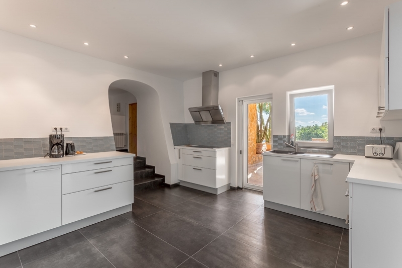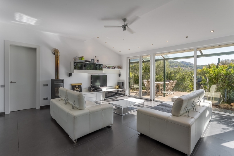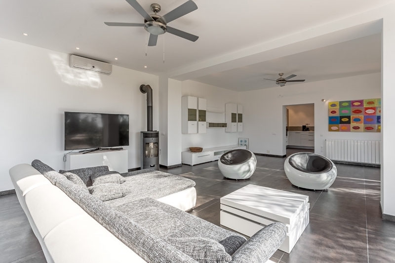 The upper part of the house consists of a large living area with open kitchen and a small bedroom as well as a large terrace.