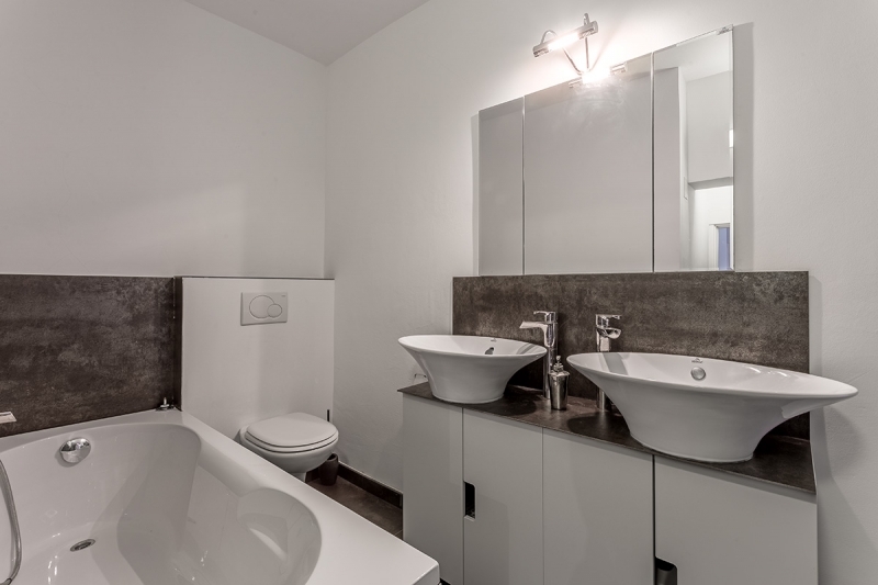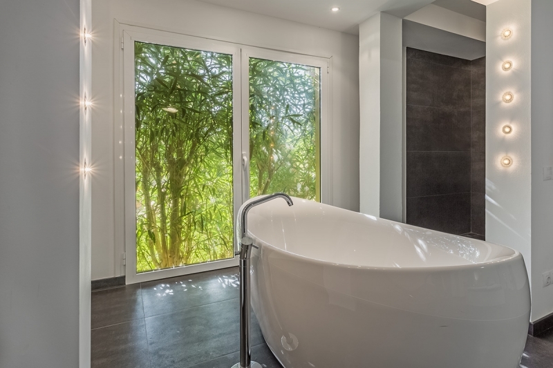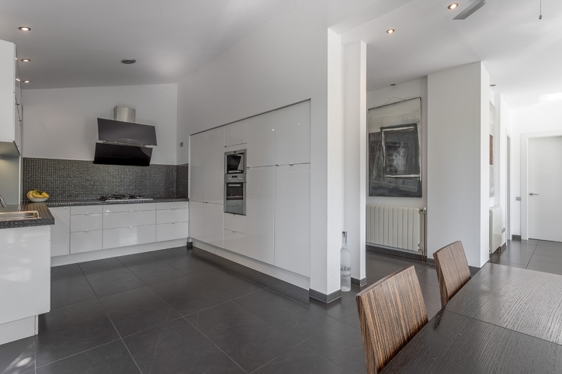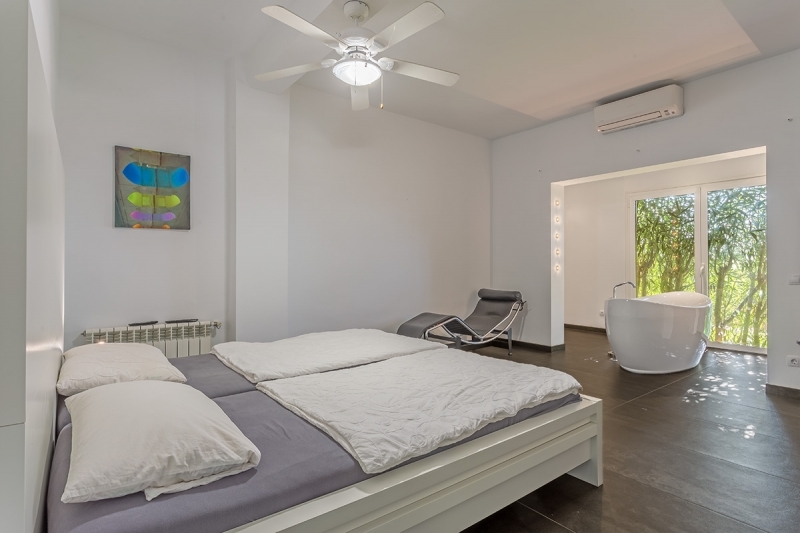 The lower part of the main house is divided into a large and modern living area, complete with window fronts, an open high-gloss kitchen as well as 4 double bedrooms with bathrooms en suite + another bedroom and a dressing room. The master bedroom is equipped with a free-standing bathtub and a large, modern shower.