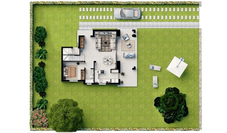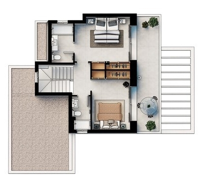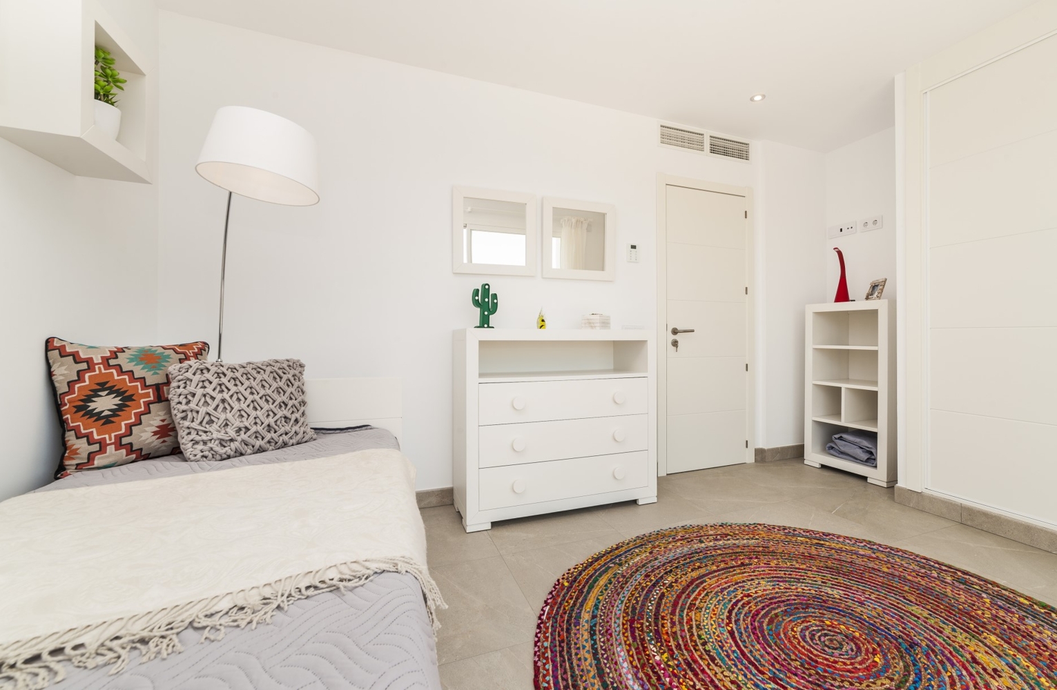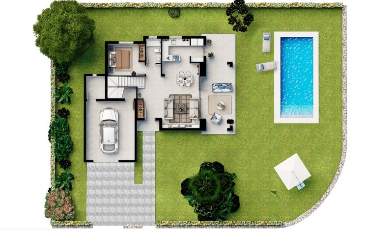 These new villas,in contemporary and minimalist style, have been carefully designed to offer spacious, bright rooms, maximising space and confort. They all have 3 double bedrooms and 3 bathrooms, fitted kitchen and laundry room, living and dining room with pre-installation of a fireplace, large terraces and garden. The plot also includes a private parking space and a storeroom.Our customers will have the option to persoonalize their new home having also available a selection of optional extras that you can choose from depending upon the stage the build is at: pool, heated flooring, air conditioning, garage, fireplace, etc