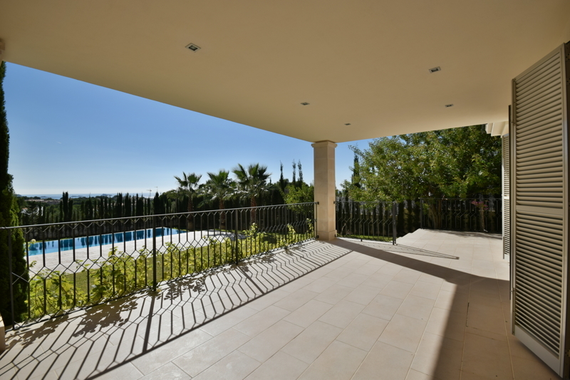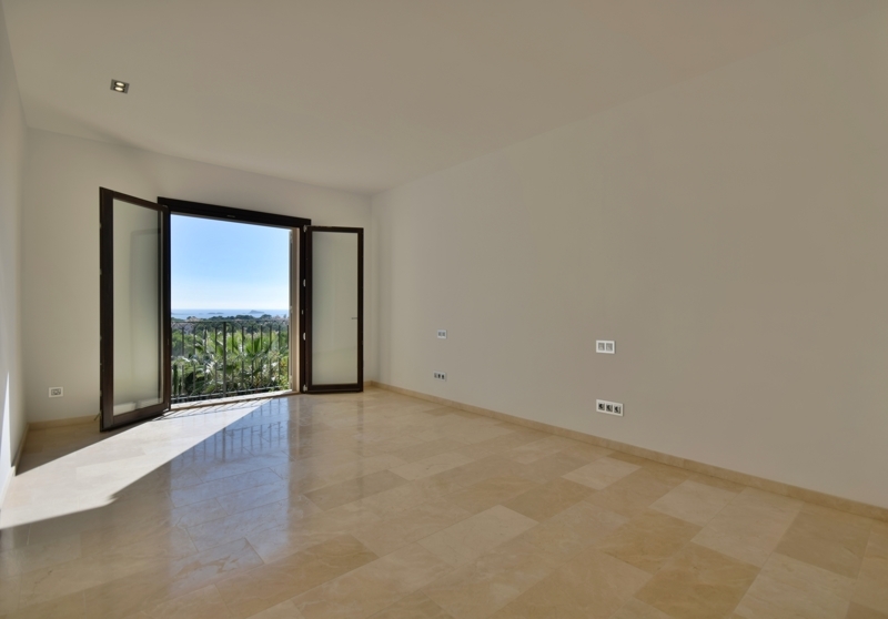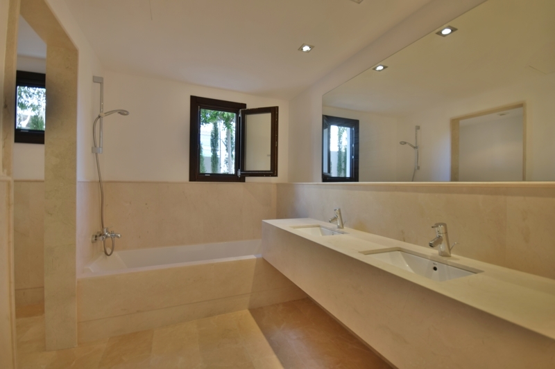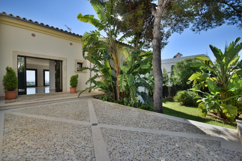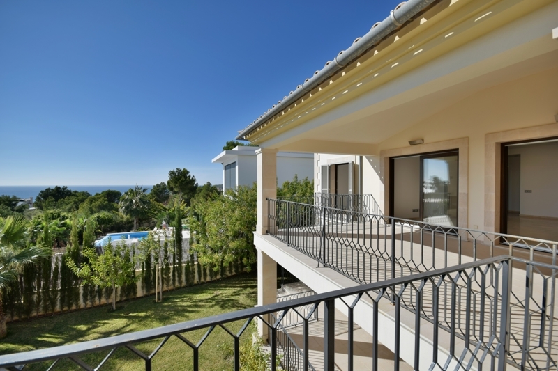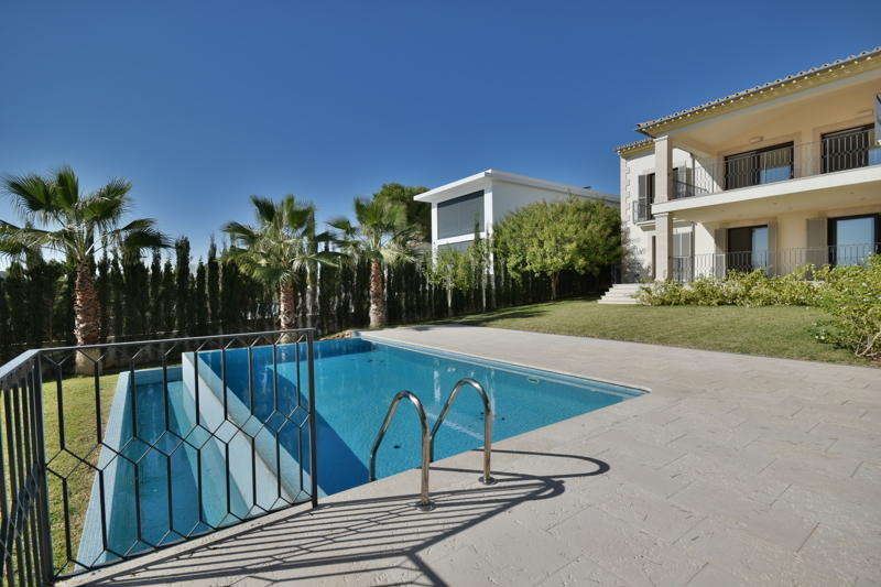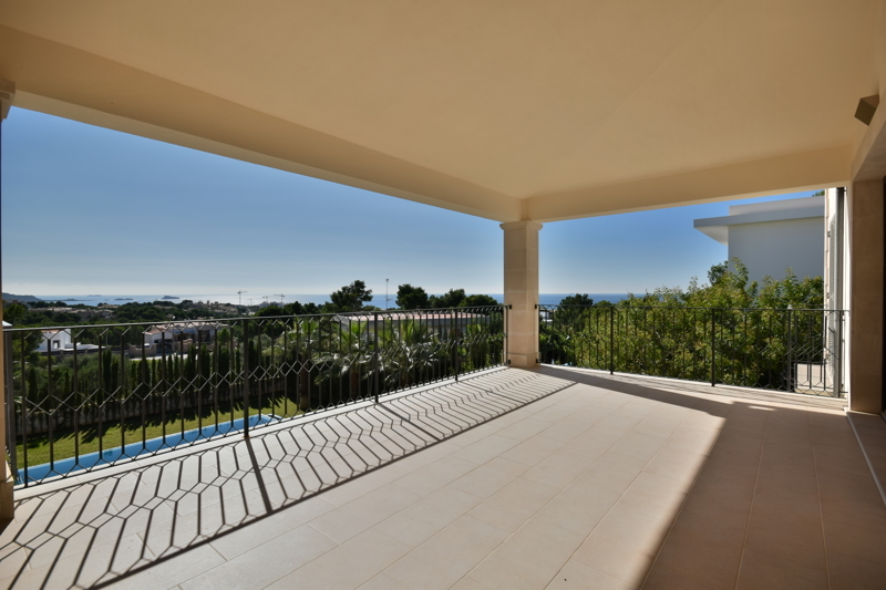 This villa, constructed in modern finca style, is situated in the Golf area of Santa Ponsa on an even plot of approx. 1.145 m2. The villa is characterized by quality construction and quality features as well as spacious floor plan on a constructed area of about 367 m2.The main level with a constructed area of approx. 245 m2 offers breathtaking sea views. This level consists of living room of approx. 50 m2 with fireplace and access to a roofed terrace of about 34 m2, open still unfurnished kitchen, utility room, connected with the double garage, guest-toilet, master bedroom and a second bedroom, both with dressing room, small balcony and bathroom en suite.