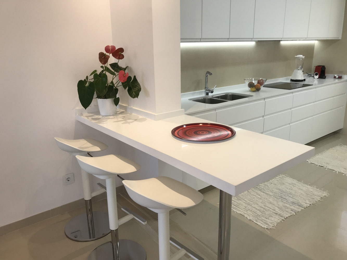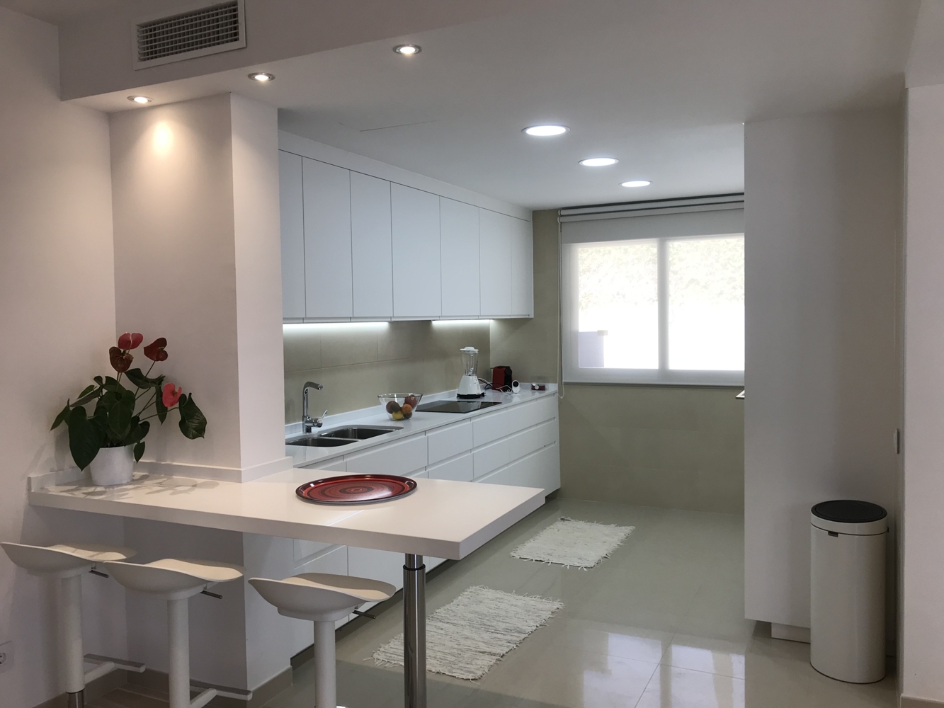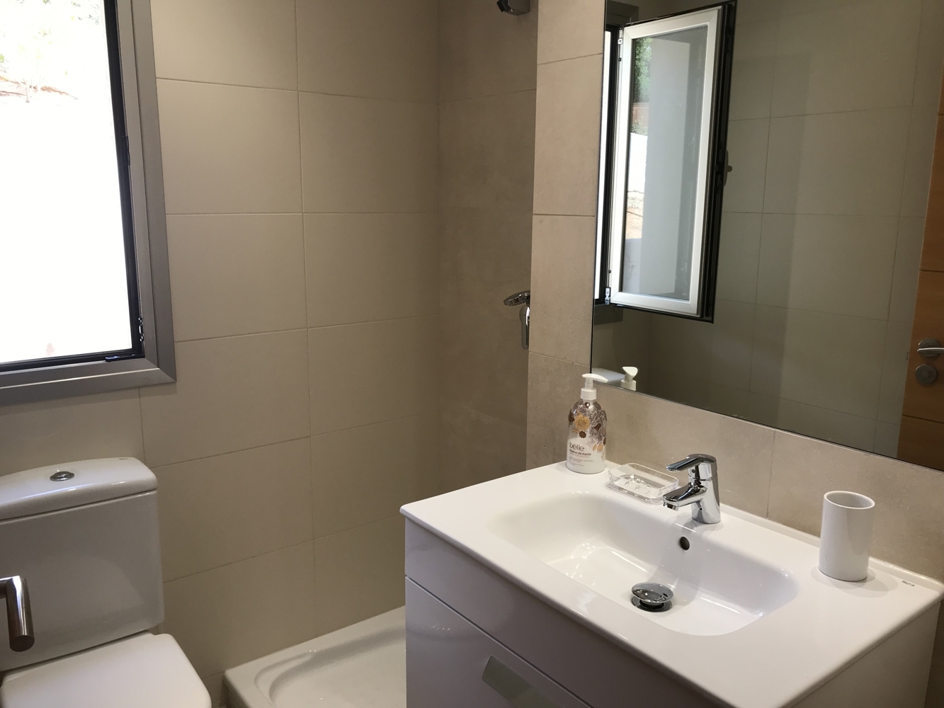 The house has excellent finishes, ducted hot-cold pump, double climalit aluminum carpentry, brand new integrated appliances: ceramic hob, oven, microwave, hood, fridge, freezer (separate) and dishwasher for 14 place settings and white quartz countertop. . The kitchen is separated from the dining room by an American bar, also made of white quartz, from where you can enjoy a good breakfast while enjoying the green of the pine trees on the hills of Cala Viñas. The bathrooms are all equipped with elegant sink cabinets. All the rooms, like the living room, have a direct USB and fiber socket. The lights in the room, being adjustable, allow you to create an infinite number of environments that adjust to the activity carried out and the time of day.
