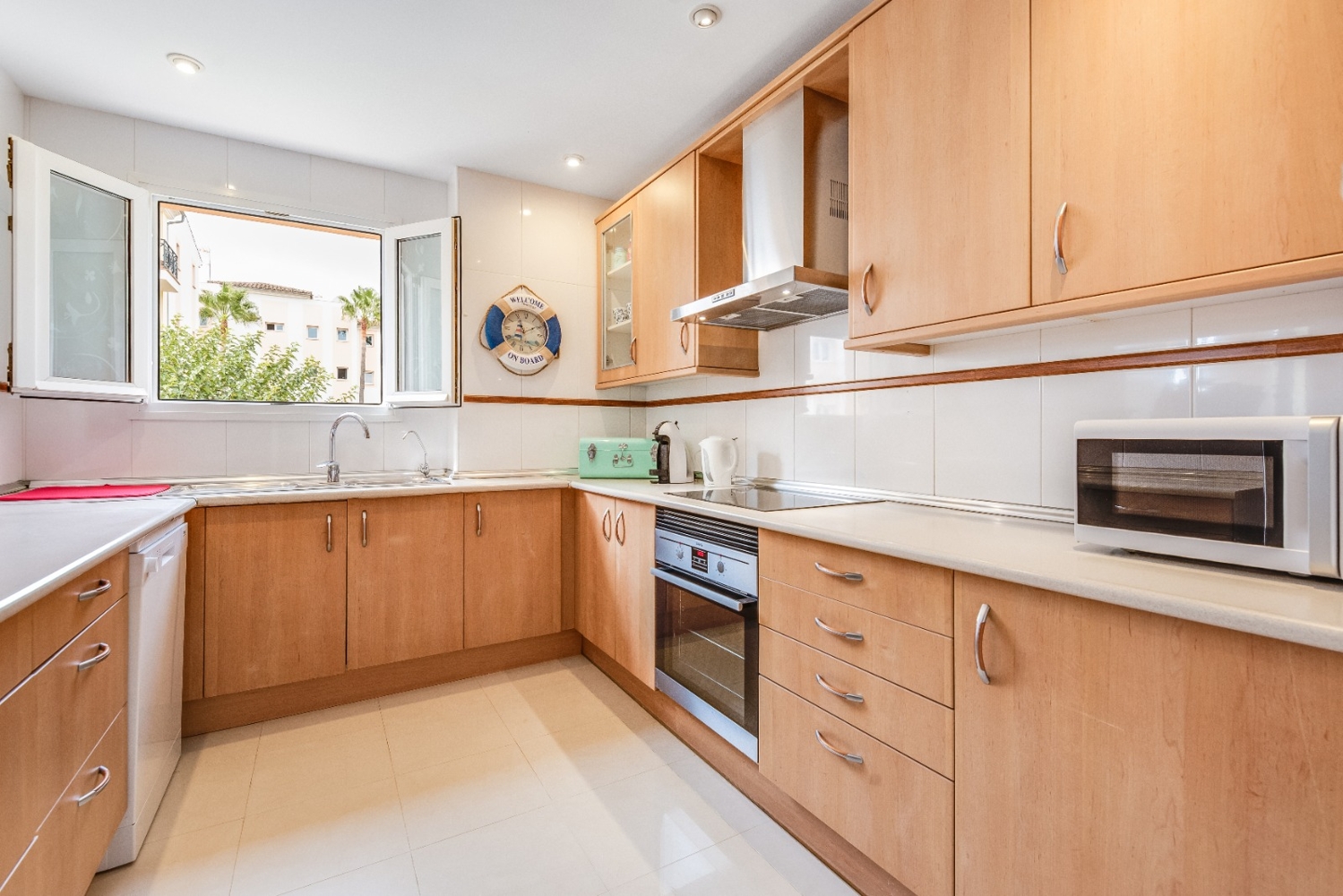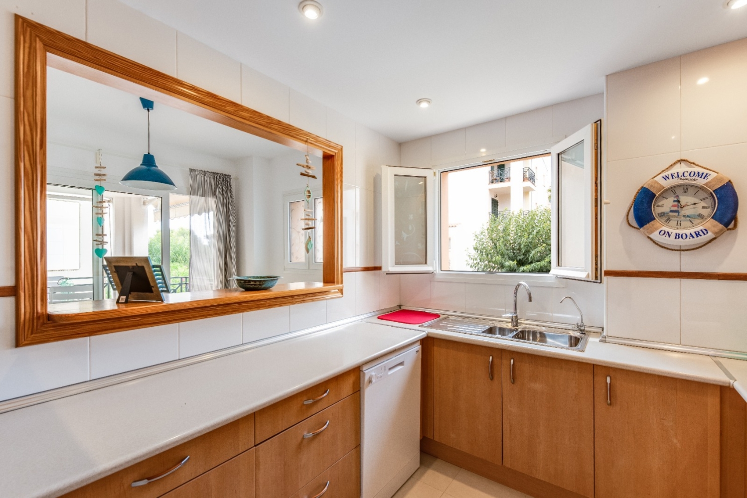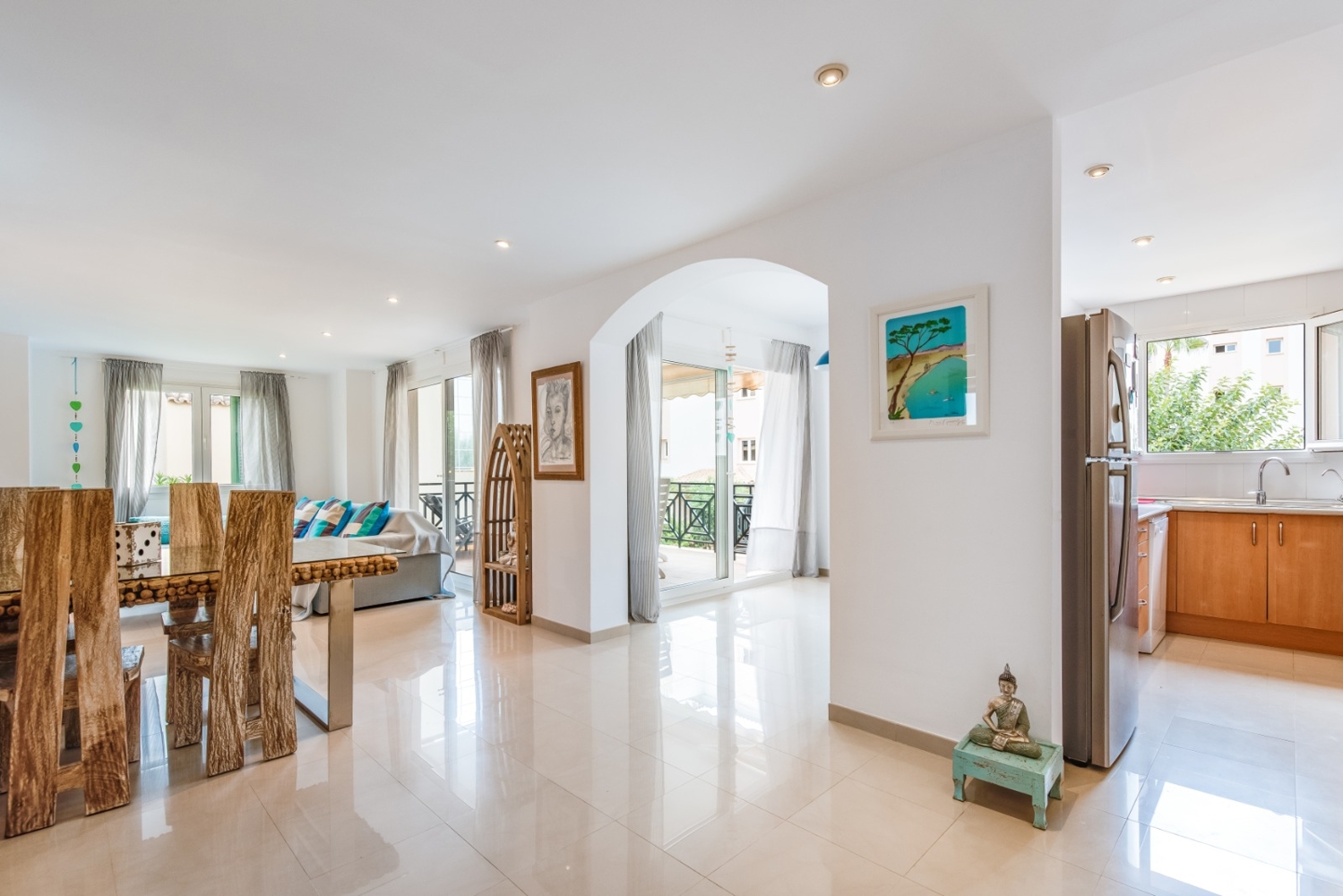 This large, very bright, and spacious 140 m2 apartment is in a beautiful and central luxury community in Santa Ponsa, offering several well-kept communal swimming pools and gardens. All services, such as supermarkets, shops, restaurants, beaches, and the sea are within walking distance.The apartment is located on the 1st floor and is distributed in an entrance hall, a large living room with a dining room, and a semi-open kitchen, a large terrace of approximately 13 m2 with southwest orientation. In addition, the 3 very spacious double bedrooms, with built-in wardrobes, all with their own bathroom. Other features include air conditioning h / c, a laundry room, a storage room of approximately 8 m2, 2 outdoor parking spaces, and a lift. This property is ideal for people who like to be within walking distance to all amenities and still want to live in a luxurious community and Mediterranean setting.
