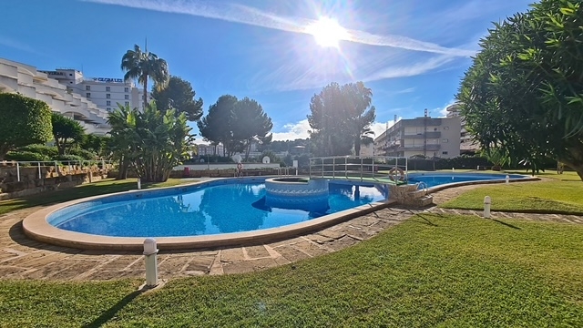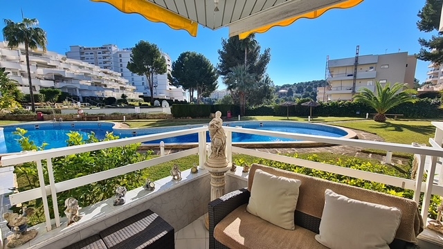 terrace with beautiful views of the communal pool and spacious gardens with private beach access.