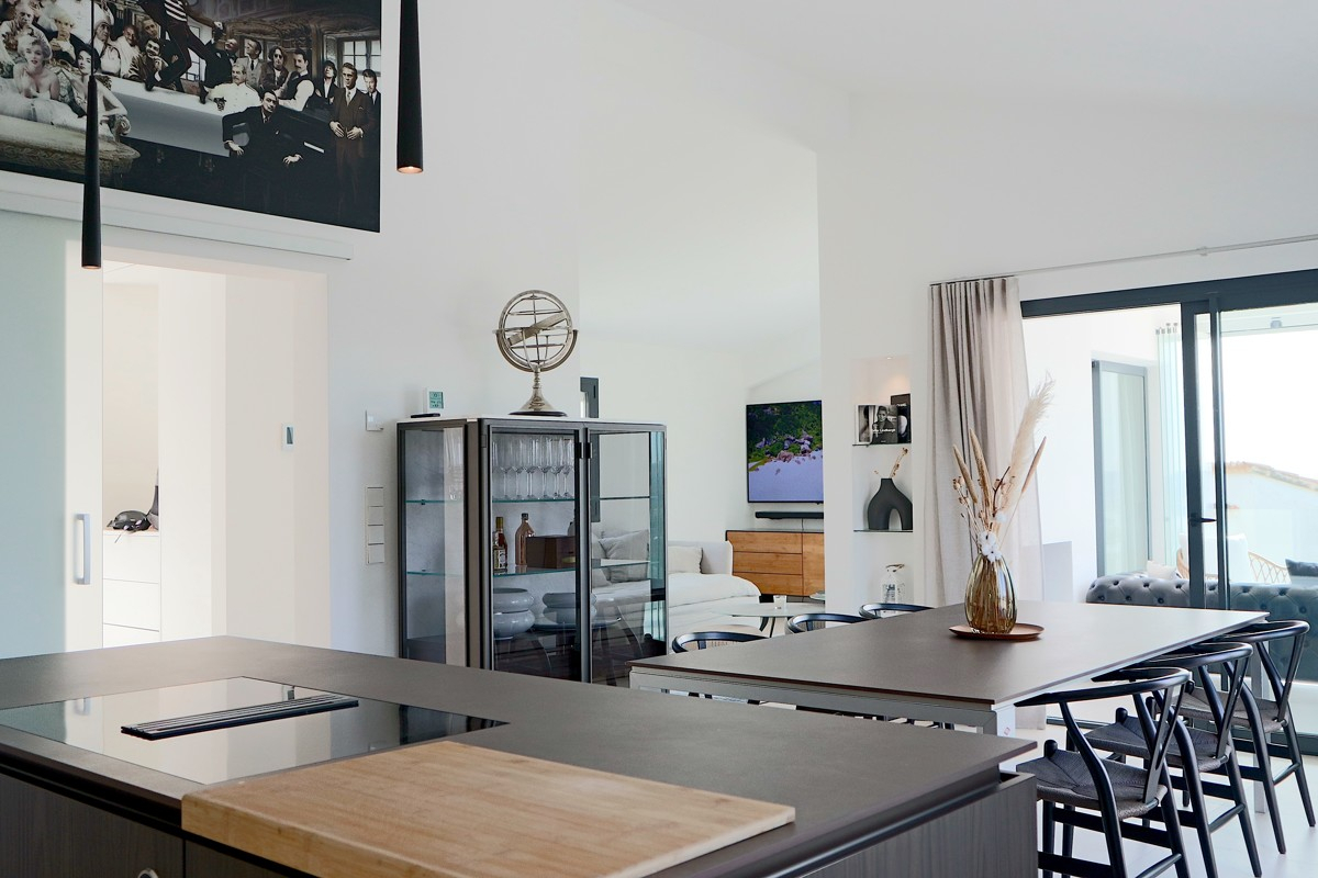 Kitchen: Open designer kitchen with cooking island from LEICHT, high-quality household appliances from MIELE and NEFF, wine cabinet (electric without handle).