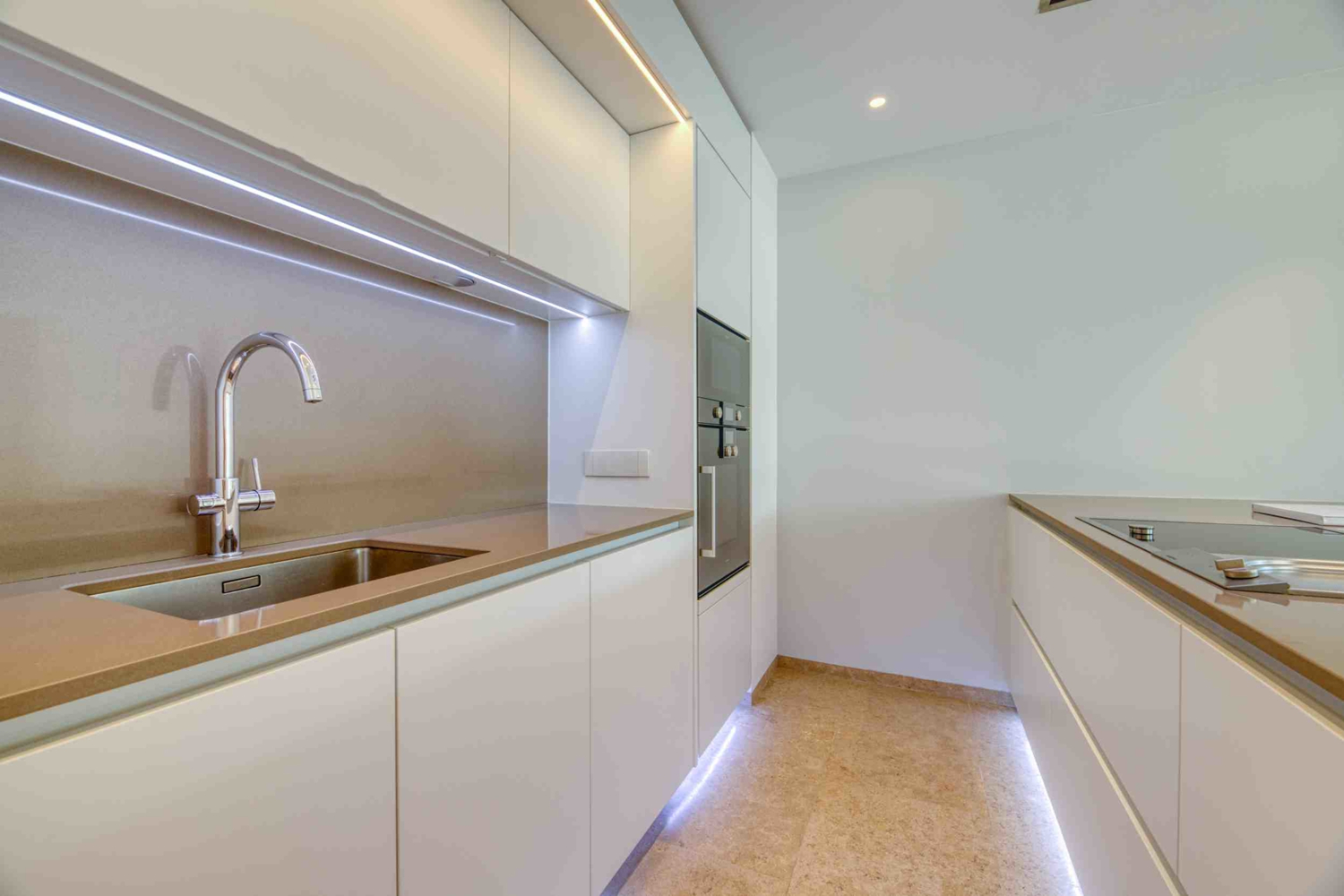 Modern villa (semi-detached house), built in 2019, sea views, private swimming pool, high-quality furnishings, spacious living room, dining area, open kitchen, fully equipped fitted kitchen with Gaggenau appliances, 3 bedrooms with en suite bathroom and dressing area, open room (4th bedroom with en suite bathroom would be possible), 2 guest toilets, real wood floorboards in the sleeping areas, natural stone tiles in the living area, fitted wardrobes with LED lighting. Bedroom with bathroom en suite would be possible), 2 guest toilets, real wood flooring in the sleeping areas, natural stone tiles in the living area, fitted wardrobes with LED lighting, Grohe and Duravit bathroom fittings, Gira Smart Home System, indirect lighting, underfloor heating (air-to-water heat pump), central air conditioning hot/cold, aluminum windows with heat and sound insulation glass, electric shutters, satellite TV, internet connection via fiber optics, high security entrance door, solar panels (hot water), open and covered terrace areas, sunken lounge area, good privacy, south-facing, 1 underground parking space with access to the house, 1 parking space directly in front of the house, utility room, cellar rooms, communal pool with sea views, modern fitness room, SPA area (heated indoor pool, whirlpool, dry sauna, steam sauna, further fitness room), concierge service, office space for private use, security service and much more.Property location