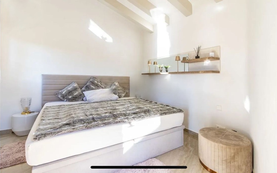 The bright living and dining area opens generously onto the sun terrace with private pool and well-tended garden, which invite you to relax and enjoy the Mallorcan sun. The residents of the complex also have access to a communal pool area.