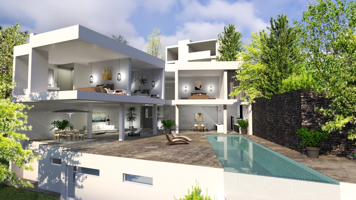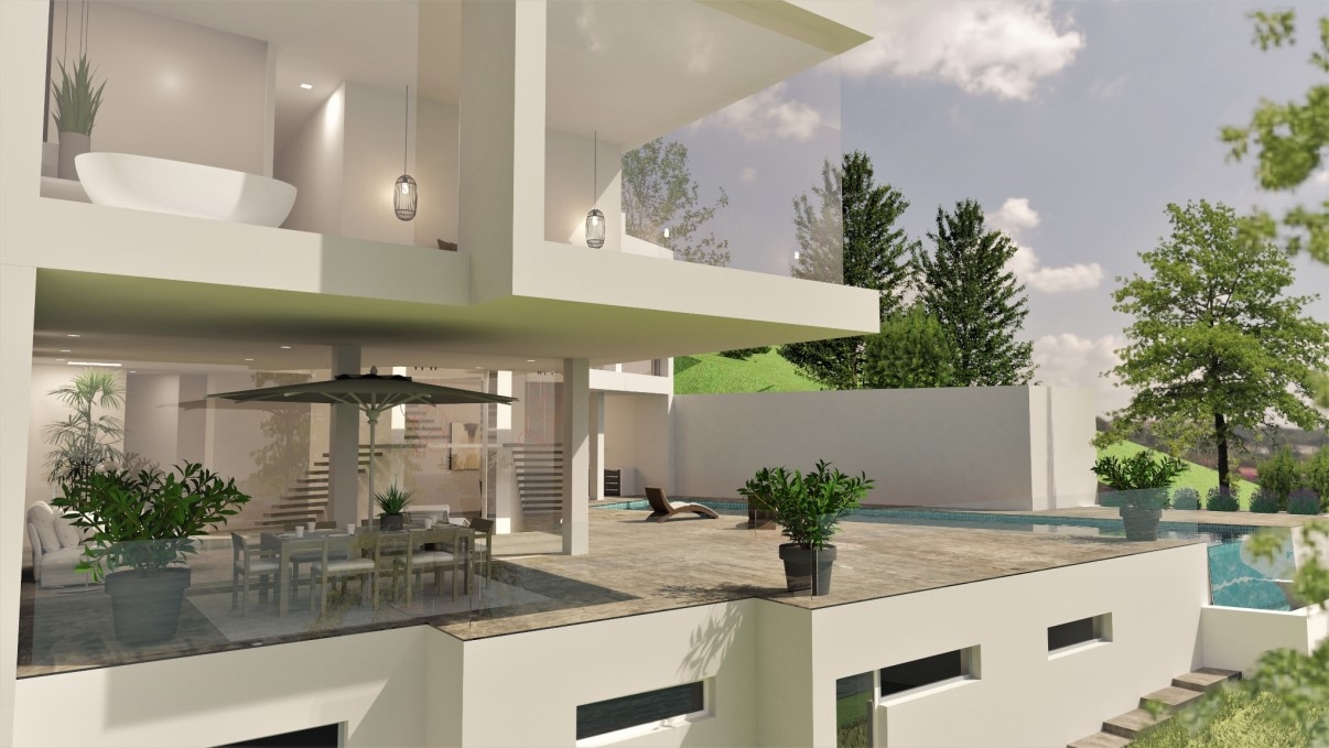 En una gran parcela de 1.320 m2, situada tranquilamente en una calle sin salida, se está construyendo una villa moderna y con estilo.