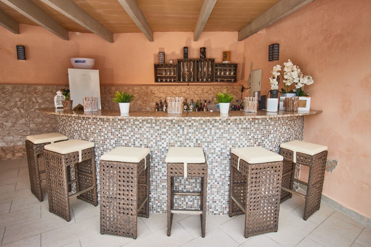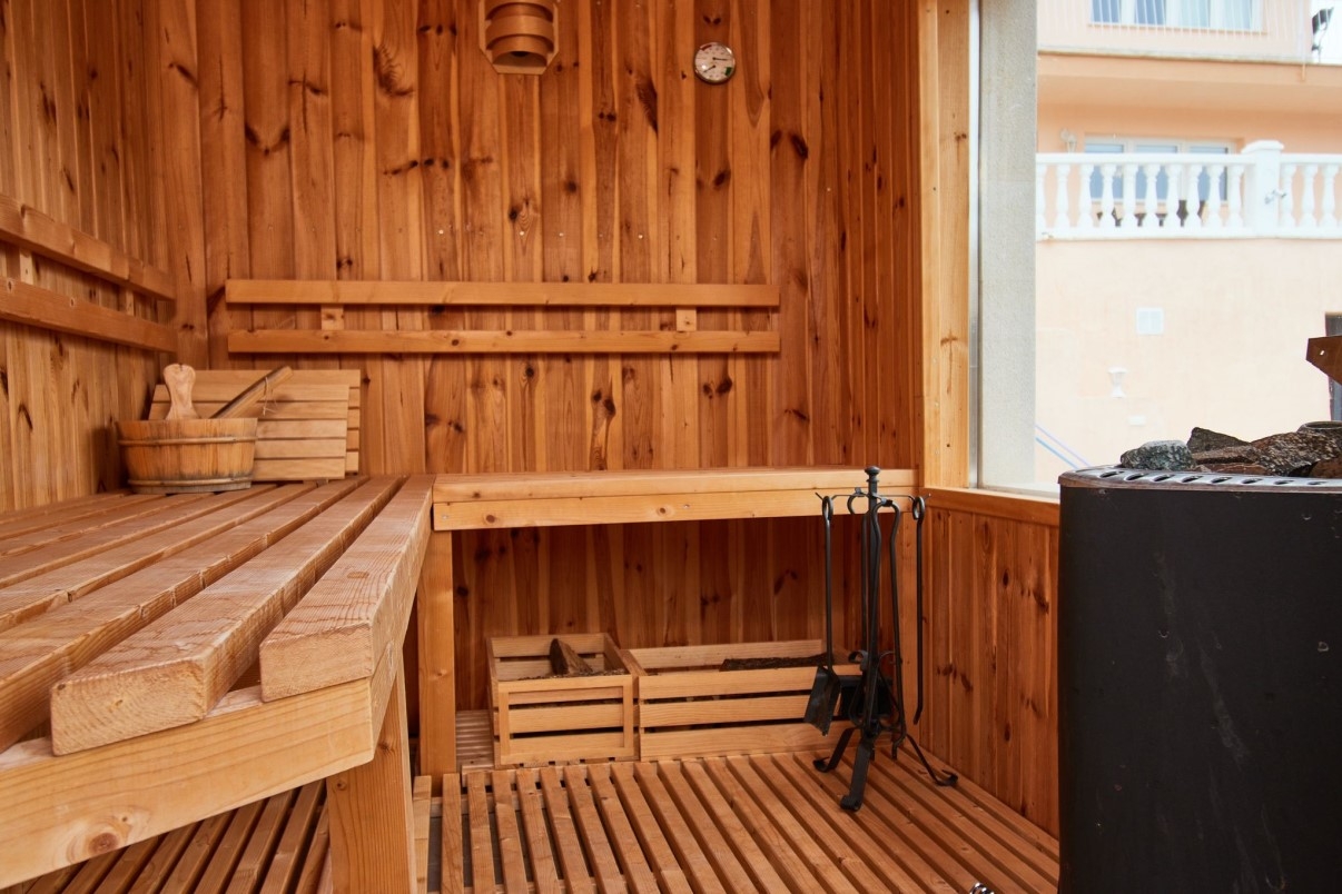La gran zona de la piscina también cuenta con una zona de sauna, un bar y mucho espacio para relajarse y disfrutar.