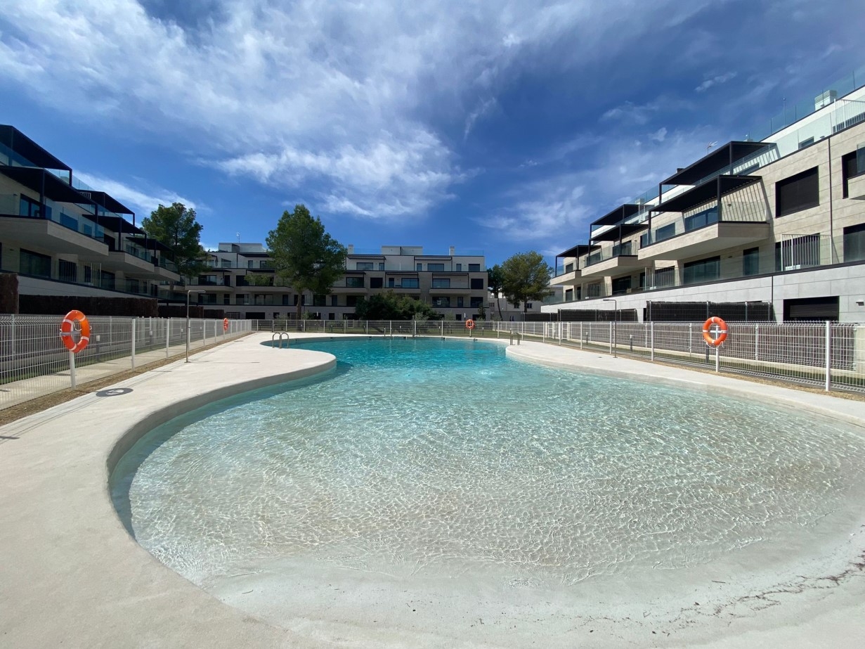 Piso de nueva construcción en primera ocupación en Santa Ponsa. El piso está situado en la 1ª planta y dispone de 2 dormitorios dobles, 1 dormitorio individual o despacho, salón con cocina abierta, 2 baños y una amplia terraza orientada al oeste.Mobiliaro