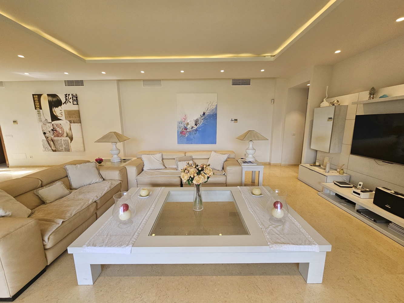 La villa cuenta con dos acogedores salones. El amplio salón de la planta baja es ideal para socializar. El salón de la planta superior ofrece un ambiente más acogedor y relajado y está equipado con una chimenea que invita a relajarse en un ambiente acogedor.