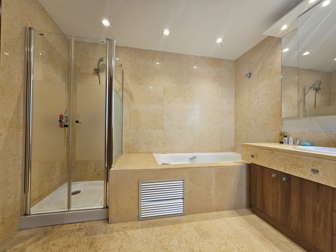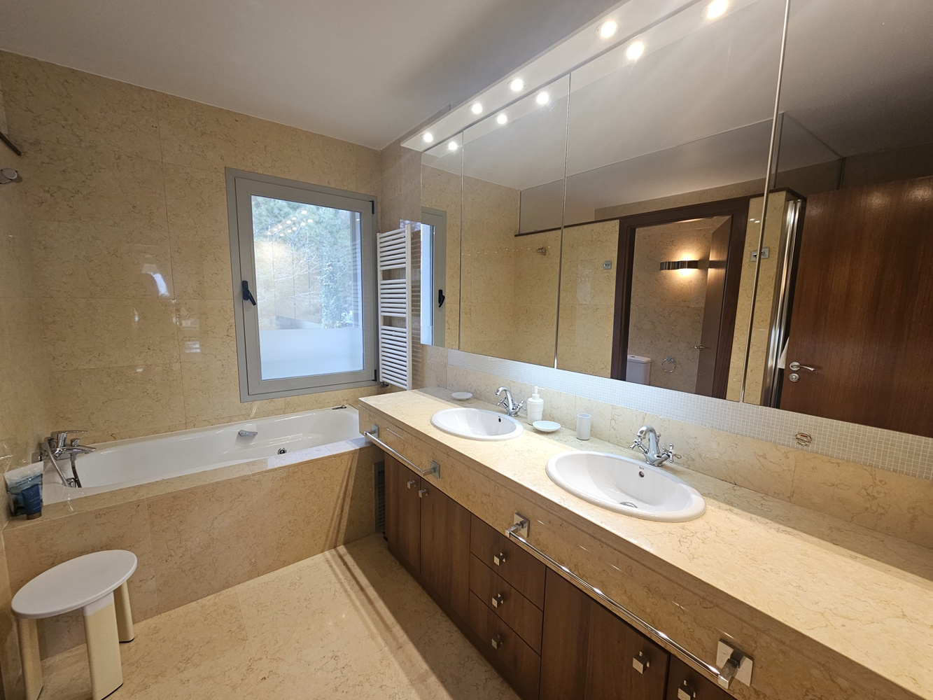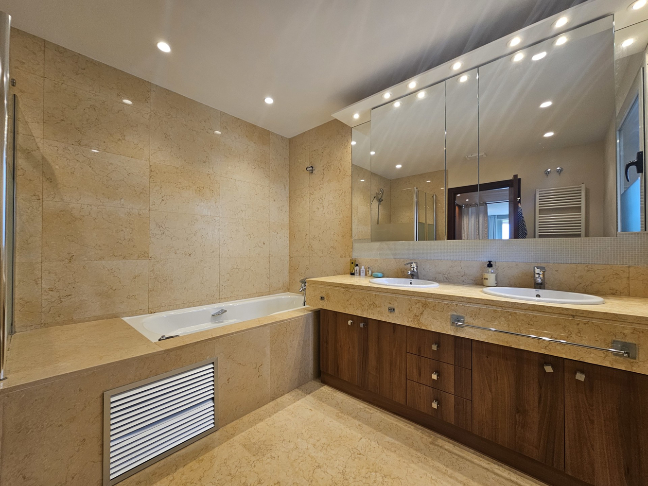 Rodeada de un exuberante jardín privado, la zona exterior es un verdadero refugio. La impresionante piscina, la zona de barbacoa con bar y la espaciosa terraza cubierta de la planta baja ofrecen el marco perfecto para socializar y relajarse. Para mayor comodidad durante todo el año, las zonas de salón y comedor exteriores están equipadas con calefactores eléctricos, creando un ambiente acogedor incluso en invierno. La gran terraza comunitaria de la planta superior ofrece unas vistas impresionantes y un refugio bañado por el sol.