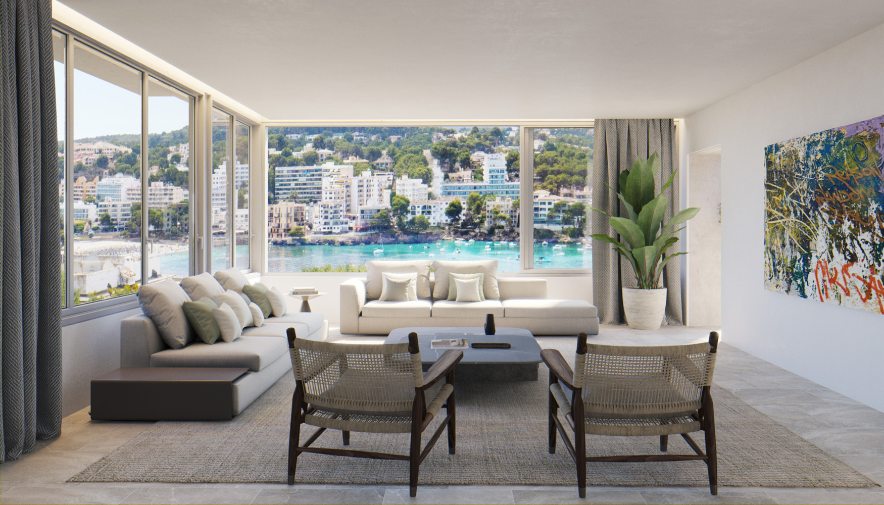 Hermosa villa de nueva construcción con fantásticas vistas al mar sobre la bahía de Santa Ponsa.Esta moderna villa ofrece 5 dormitorios y 5 baños en 513 m2. La parcela en ladera tiene un tamaño de 1320 m2.