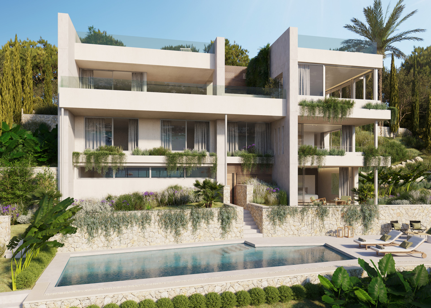 Excelencia arquitectónica: Moderna fachada de diseño energéticamente eficiente (calificación preliminar B) con muros de doble aislamiento y ventanas A++ para una óptima climatización y reducción del ruido.Tecnología avanzada: Aire acondicionado, calefacción por suelo radiante, bomba de calor de alta eficiencia y funciones de hogar inteligente con control remoto para mayor comodidad y sostenibilidad.