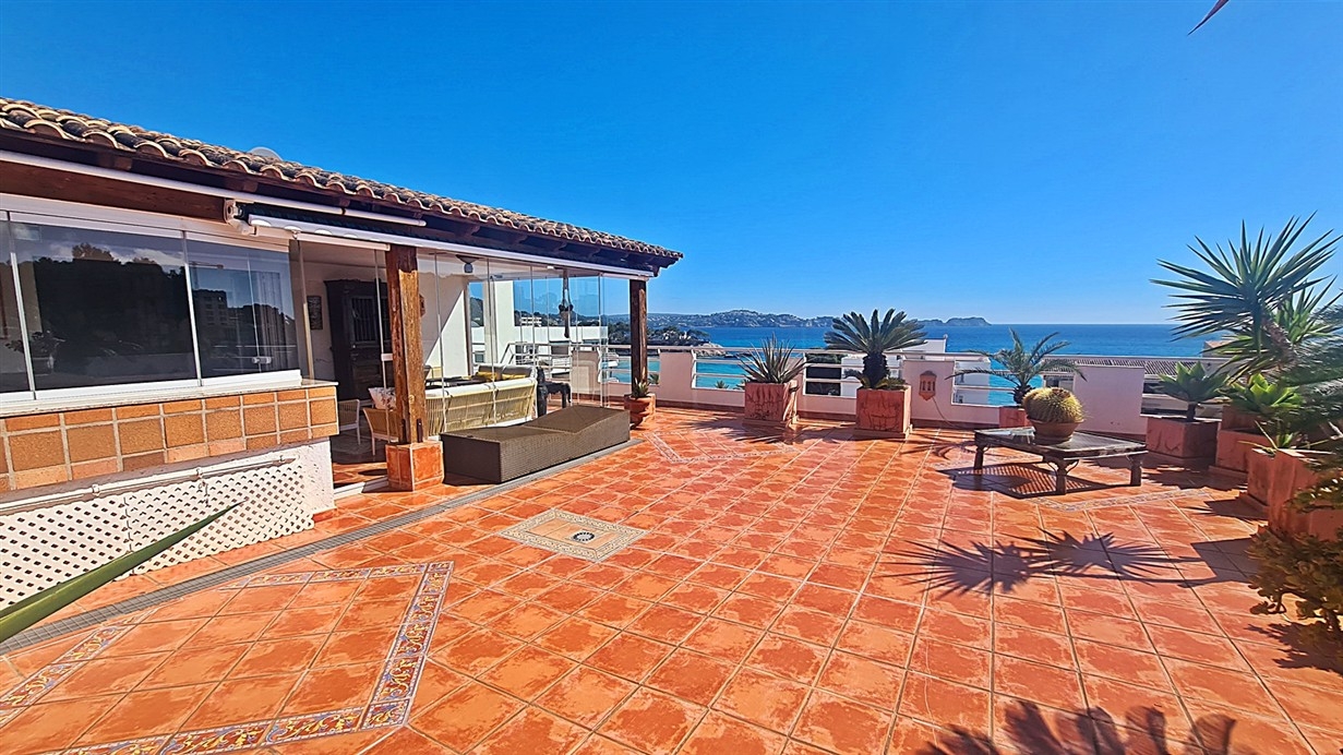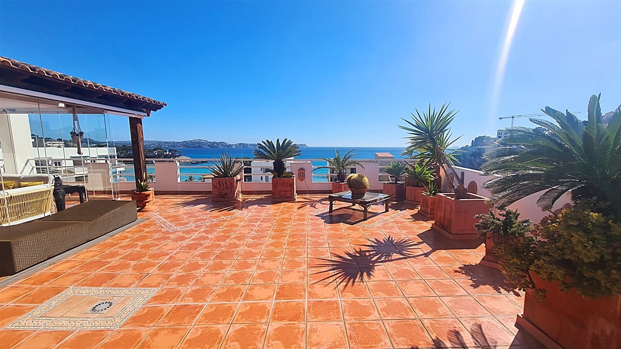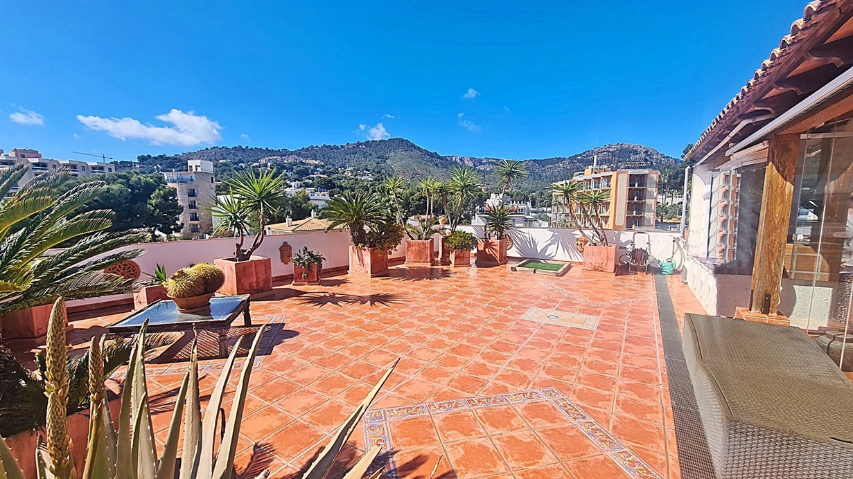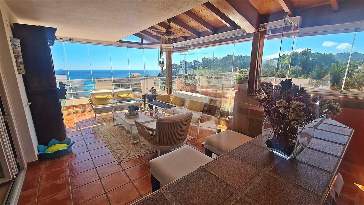 Ático por encima de Paguera con vistas reales sobre la playa hasta el mar - El amplio salón-comedor con cocina semi-abierta fluye a la perfección en la terraza panorámica parcialmente acristalada - con cocina exterior integrada y ducha independiente.